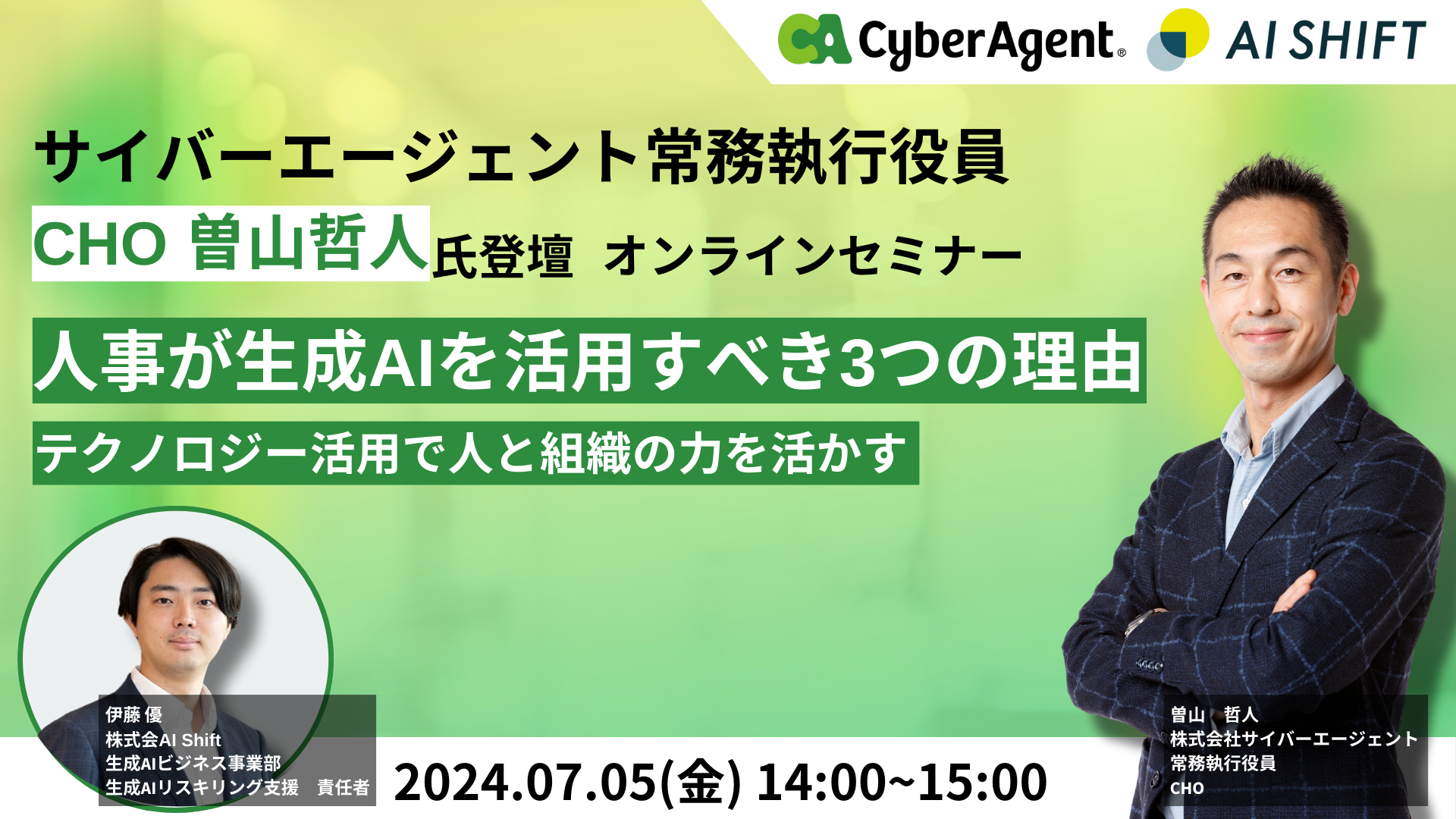 職種別カリキュラムの提供に先立ち、「生成AIリスキリング for 人事」について、実際に受講したサイバーエージェント常務執行役員・CHOの曽山哲人氏と、当社の生成AIリスキリング支援責任者を務める伊藤優が、「人事が生成AIを活用すべき理由」について解説します。