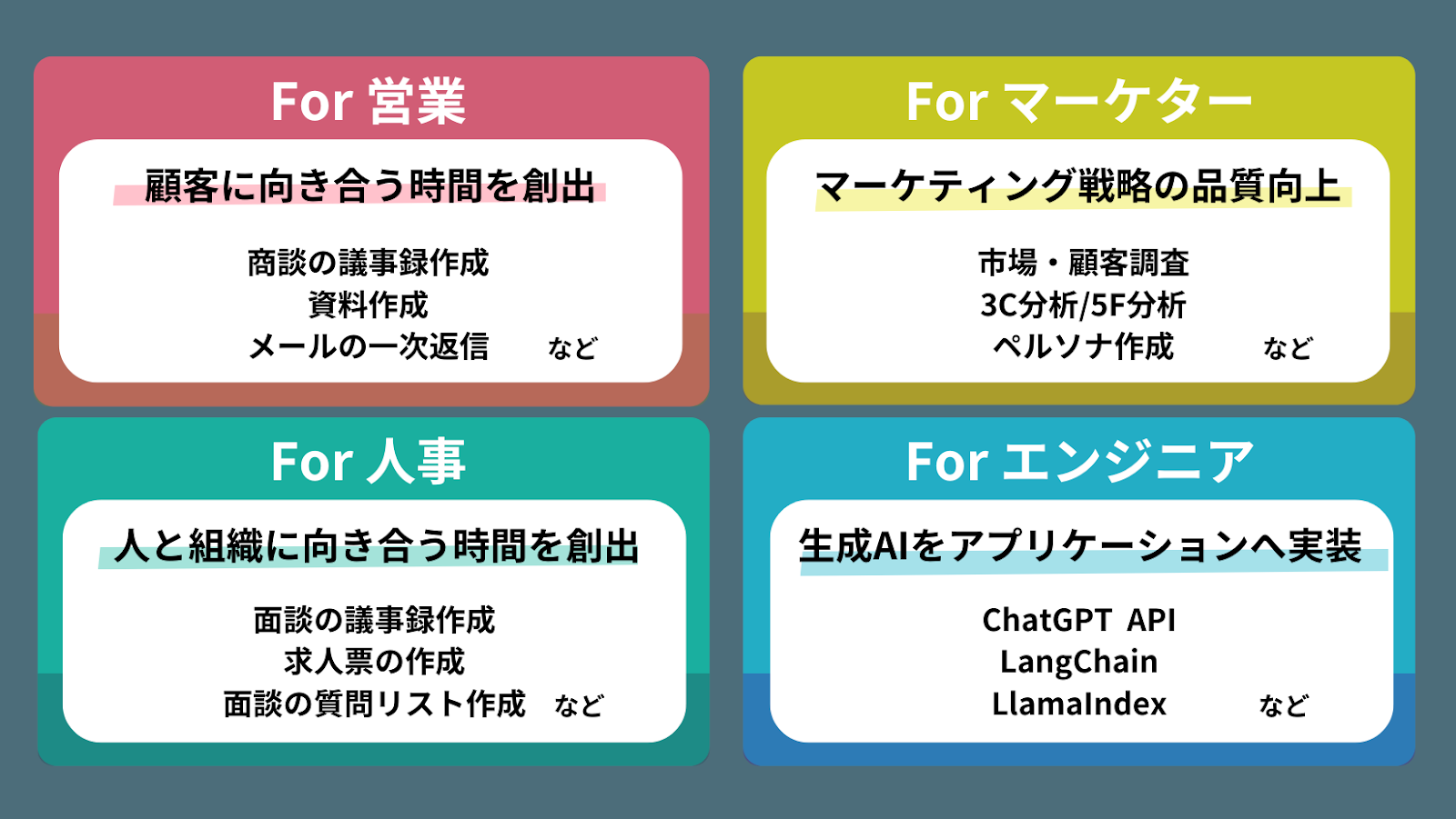 このたび新たに開始する職種別カリキュラムでは、従来の「生成AIリスキリング」に加え、営業・マーケター・人事・エンジニアの職種ごとに特化した講座を提供いたします。
