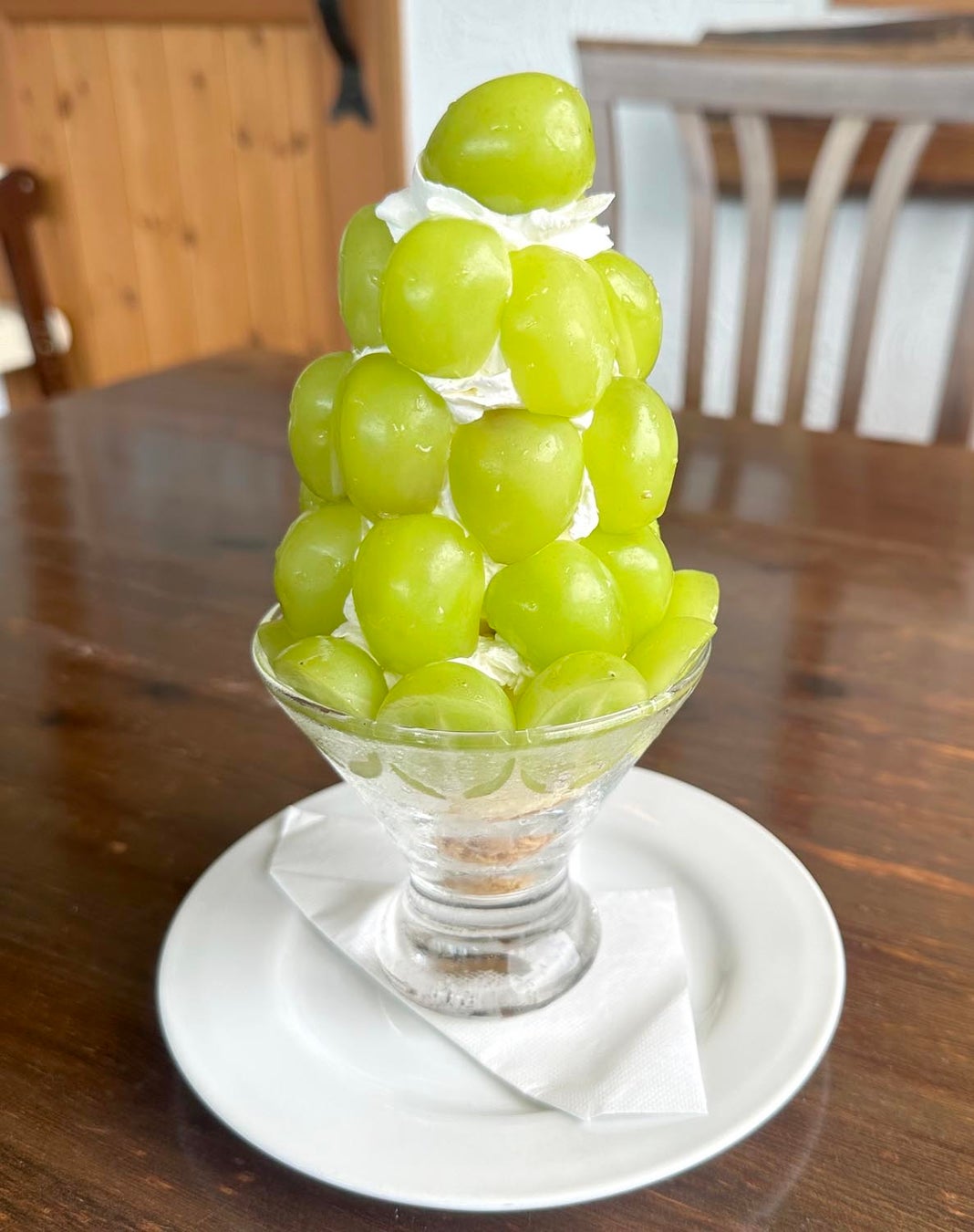 季節の大粒のシャインマスカットをたっぷり使い、ホイップクリーム・ソフトクリーム・バニラアイスが重なり、シャインマスカットの淡い酸味と甘さとクリームの優しい甘さが口に広がる幸せになる一品です。