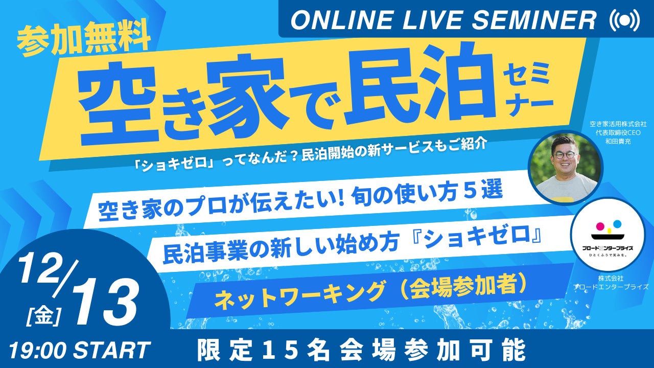 12/13(金)19:00〜 「ショキゼロ」で始める空き家民泊セミナー開催(参加無料)