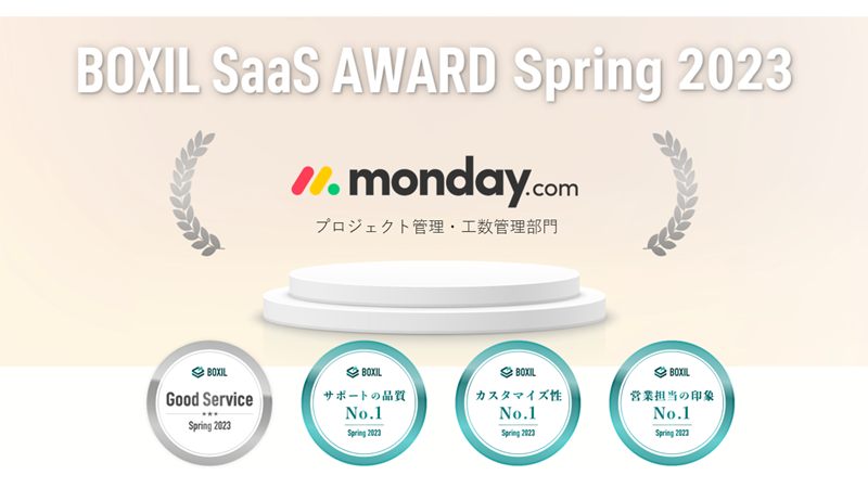「BOXIL SaaS AWARD(ボクシル サース アワード)」は、SaaS比較サイト「BOXIL SaaS(ボクシル サース)」を運営するスマートキャンプが、優れたSaaSを審査、選考、表彰するイベントです。今回の「BOXIL SaaS AWARD Spring 2023」は、2022年1月1日から2022年12月31日までの1年間で新たに投稿された口コミ約14,000件を審査対象としており、「monday.com」は「プロジェクト管理・工数管理部門部門」で「Good Service」「サポートの品質No.1」「営業担当の印象No.1」「カスタマイズ性No.1」 4つの賞を受賞しました。