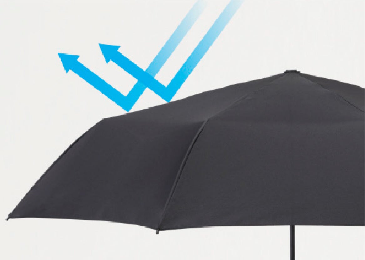 親骨にFRP(スノーボードや釣竿に使用)、受骨にポリカーボネートを採用し、強風時でも安定した使用が可能です。商品の製造テストも、通常浴びる可能性のある強風は風速15mですが、2倍の風量の風速30mで行っているため、高い強度を誇ります。多様な気候に対応し、常にこの1本だけで過ごせることを目指しました。