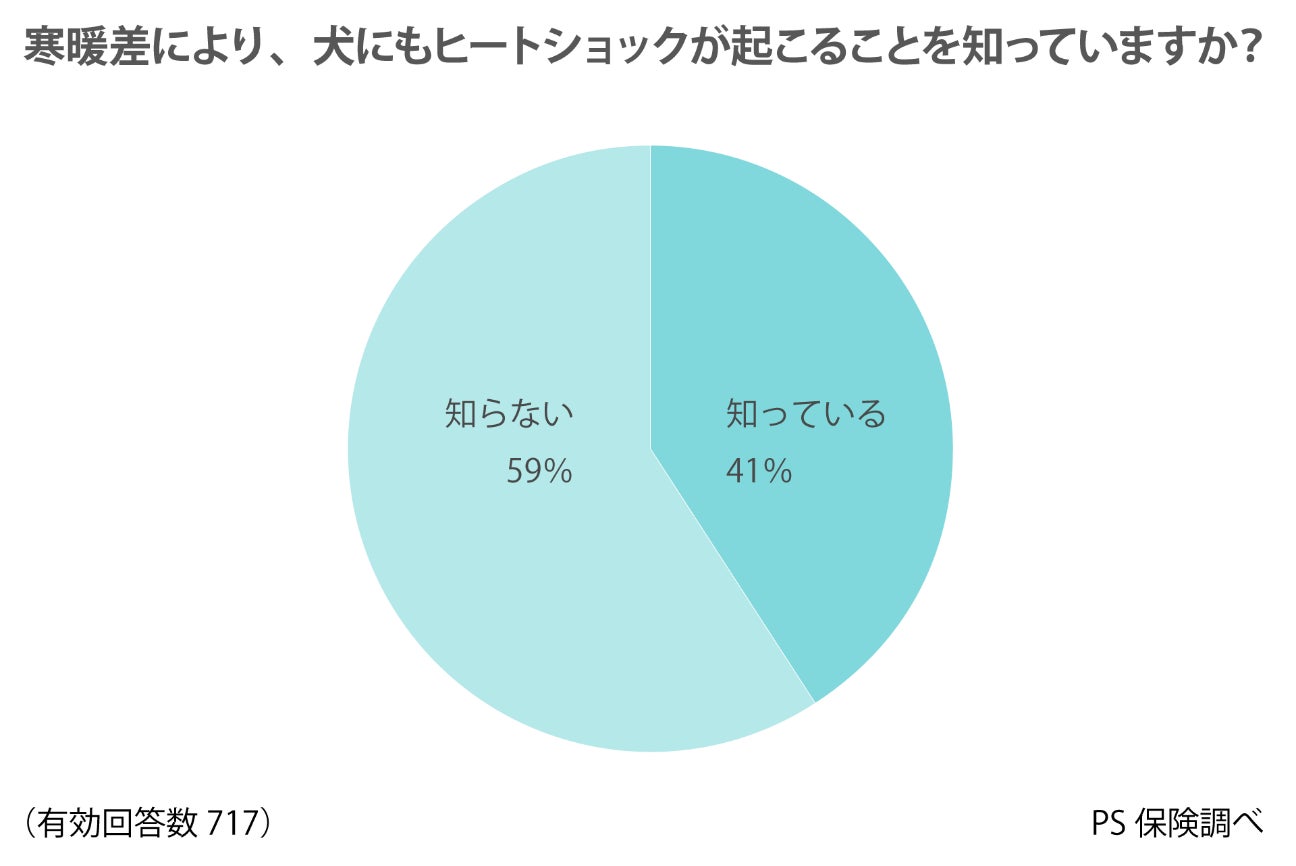 人間と同様に、犬も寒暖差による身体への負担によって「ヒートショック」と言われる体調の異変が起こる場合もあります。犬にヒートショックが起こることを知っていると回答した人は41%、知らないと回答した人は59%となり、知らない飼い主のほうが多い結果となりました。