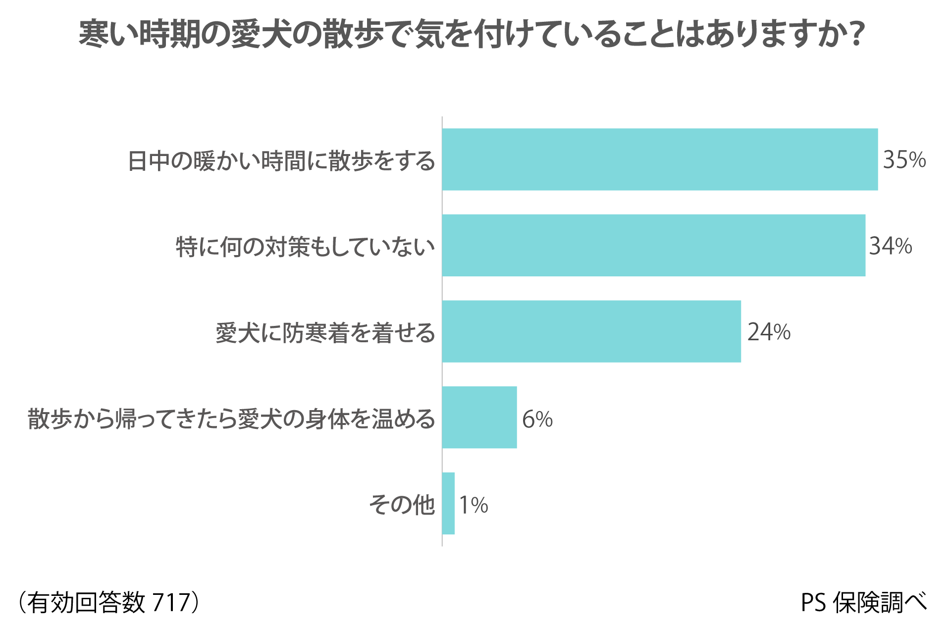 愛犬の散歩の寒さ対策として多く挙がったのは「日中の暖かい時間帯に散歩をする」(35%)、次いで「防寒着を着せる」(24%)でした。