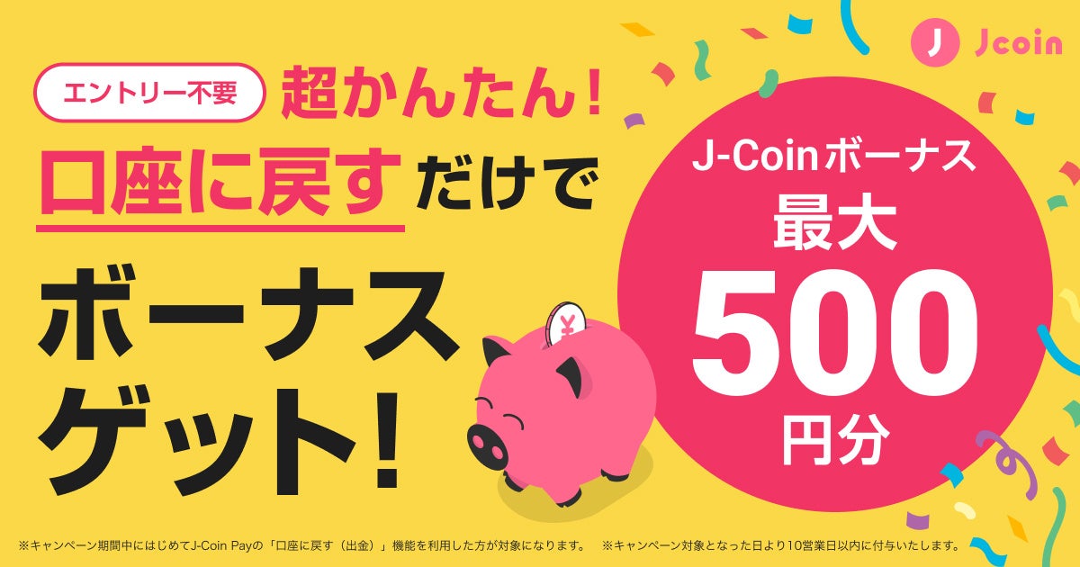 J-Coin Pay「チャージして戻すだけ!!」キャンペーンを実施。初めての『口座に戻す』機能の利用だけで、J-Coinボーナスプレゼント