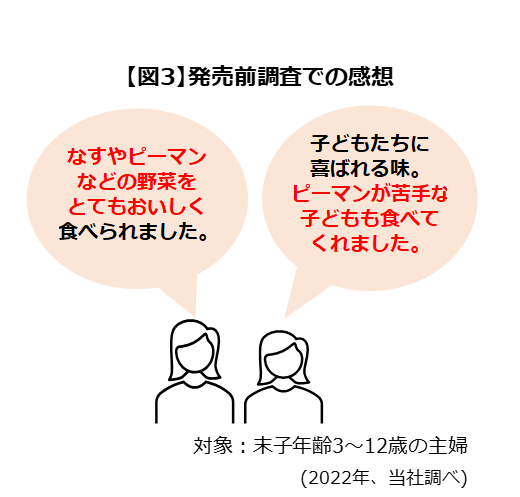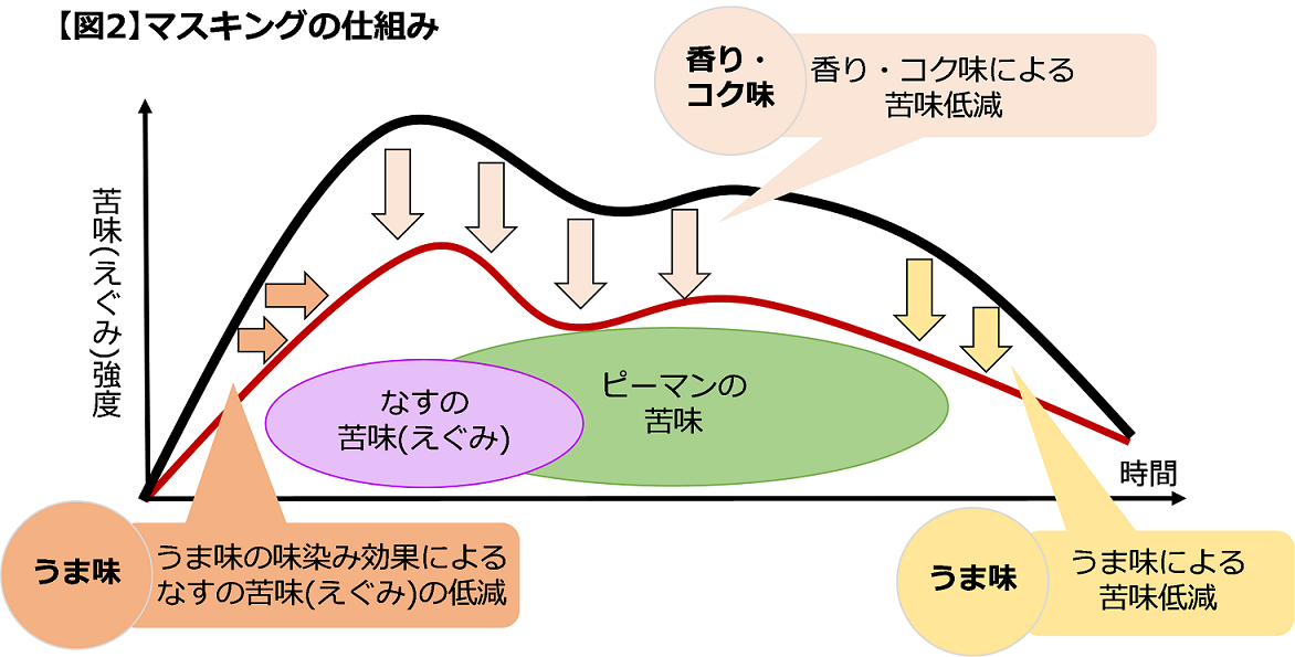 また野菜の苦みやえぐみをマスキングし、やわらげる当社独自技術(図2参照)を活用していますので、なすやピーマンが苦手な子どももおいしく食べられる麻婆茄子を手軽に作ることができます(図3参照)。