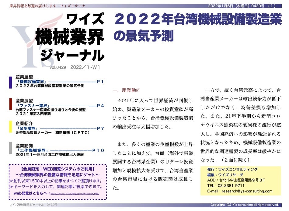 2022年台湾機械設備製造業の景気予測<ワイズ機械業界ジャーナル2022年1月第1週号発行>