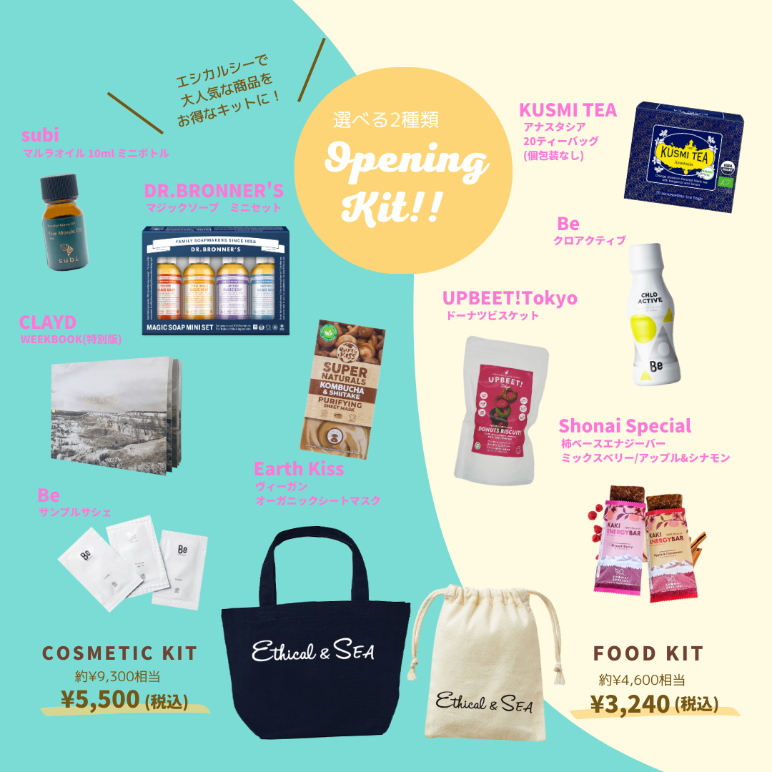 また、オープンを記念して、スタッフおすすめのエシカルコスメ・フードをおまとめしたお得な数量限定キットを発売いたします。