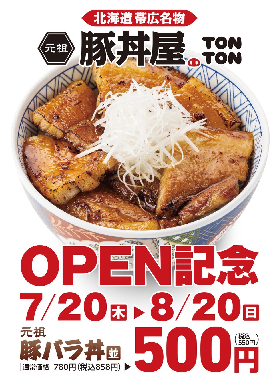浜寺元町店のオープンを記念して、7/20(木)〜8/20(日)の期間中、当店自慢の「豚バラ丼〈並〉」を特別価格500円(税込550円)にて提供いたします。