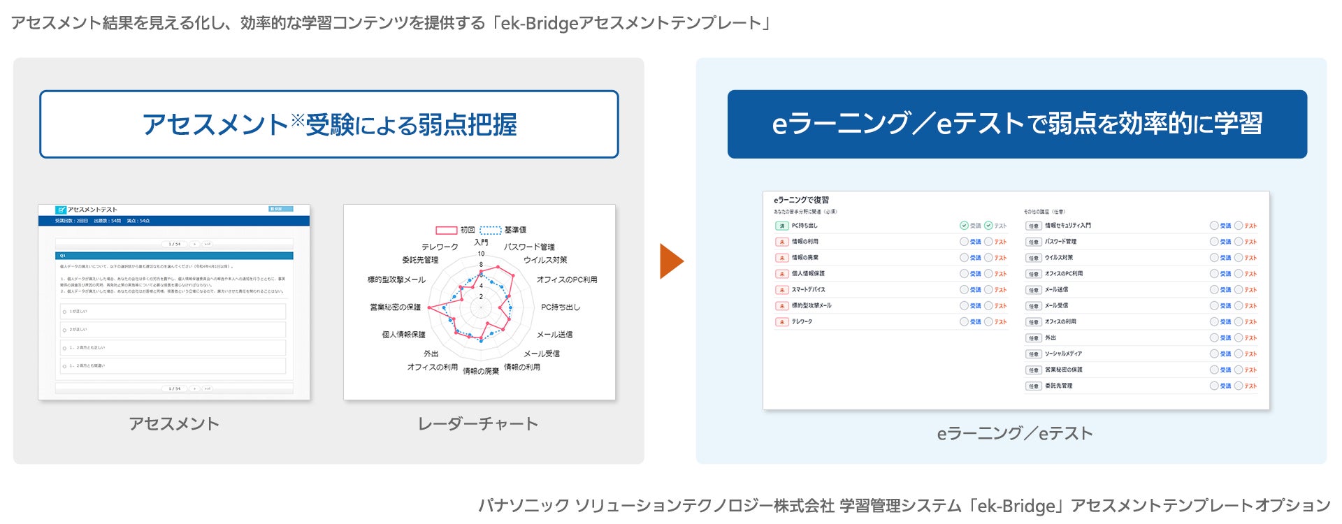 パナソニック ソリューションテクノロジー株式会社(本社:東京都、代表取締役社長:伊藤 一義/以下、パナソニック)は、受講者個々のスキルや習熟度に合わせた学習を実施できる、「ek-Bridge(イーケーブリッジ)アセスメントテンプレート」を2024年8月にリリースしました。お手持ちの教材を当社が新たに提供するテンプレートに組み込み、受講者個々の苦手分野や重点学習領域を中心に復習できるeラーニングコンテンツを短期間で制作、効率的に深い学びが得られるアダプティブラーニングを推進できます。