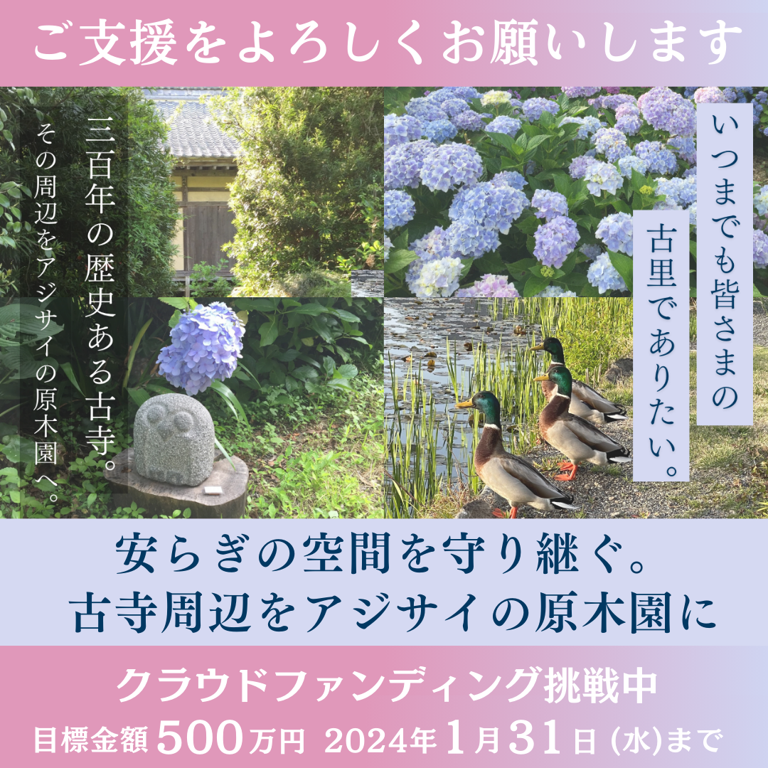 加茂荘花鳥園(所在地:静岡県掛川市、代表:加茂登志子)は、アジサイの原木をたくさん植えることによって次世代に継承しやすい運営体制に整えながらも、これまで以上に華やかで美しい「安らぎの空間」の提供を実現するために、クラウドファンディングサービス「READYFOR」にて11月28日より「加茂荘花鳥園|安らぎの空間を守り継ぐ。古寺周辺をアジサイの原木園に」を開始しています。500万円を第1目標に2024年1月31日まで支援金を募集いたします。