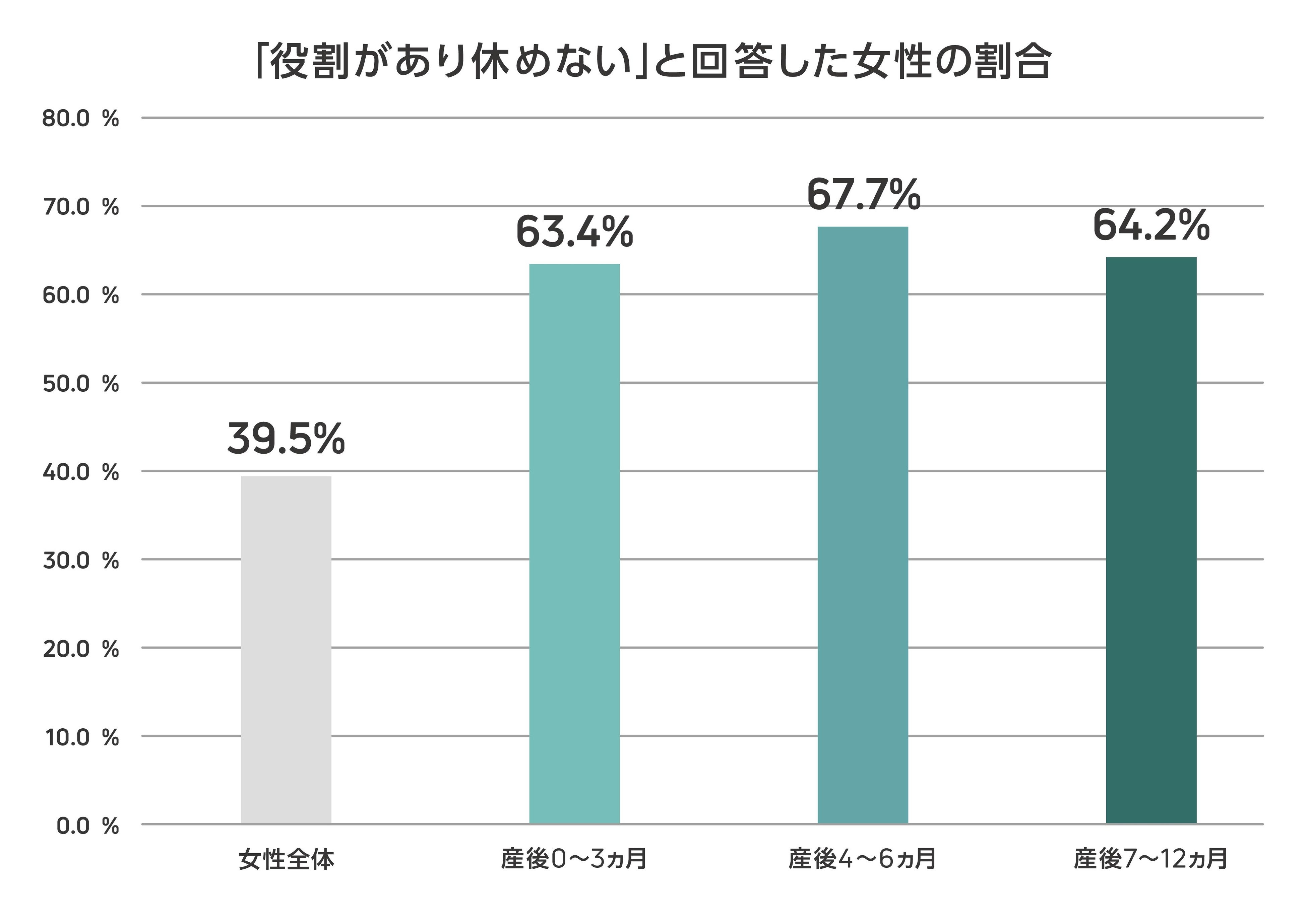 一般社団法人日本リカバリー協会と当社が共同で実施した「ココロの体力測定 2022」では、「役割があり休めない」と回答した女性が全体で39.5%であることに対して、産後1年間は約60%と20%以上高い結果となっています。このことから、日本の社会全体でお母さんに「休んでもいいんだよ」と声をかけ、負担を軽減するためにサポートすることが必要な現状にあると言えます。