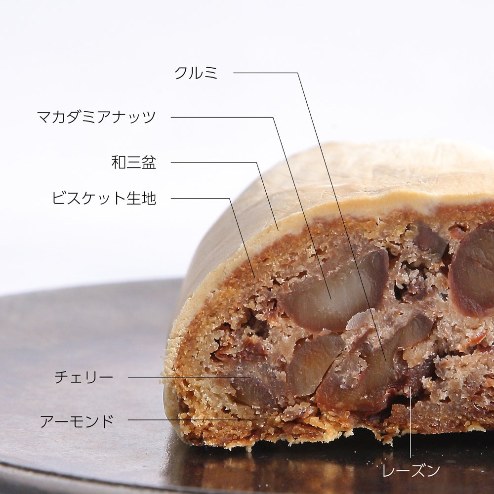 赤ワイン・グラッパ・カシスリキュールに2週間以上漬け込んだ、マカダミアナッツ・くるみ・アーモンドの3種類のナッツと、チェリー・レーズンの2種類のフルーツをたっぷりと使用。