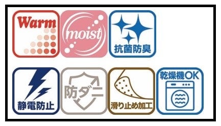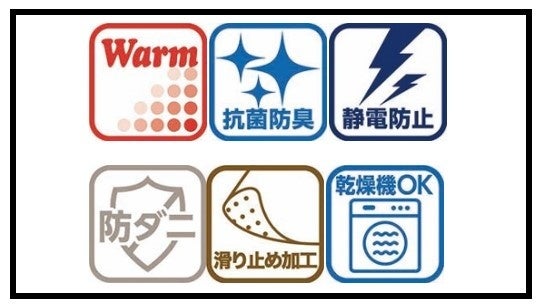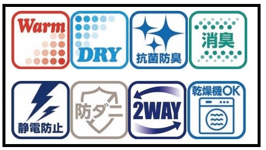 共通機能として抗菌防臭・静電防止・防ダニ機能を備えているほか、家庭の洗濯機で丸洗いでき、タンブル乾燥にも対応しています。