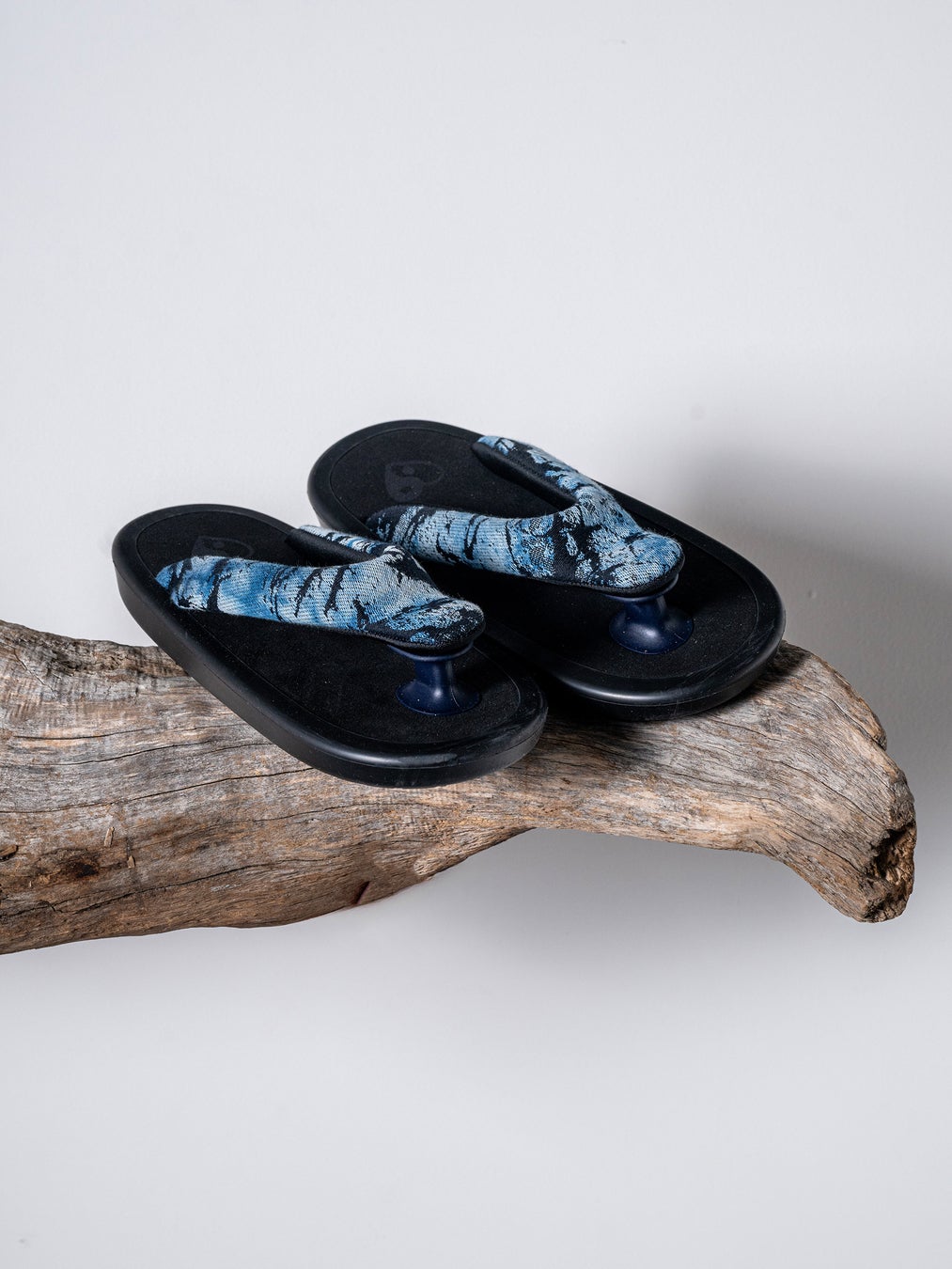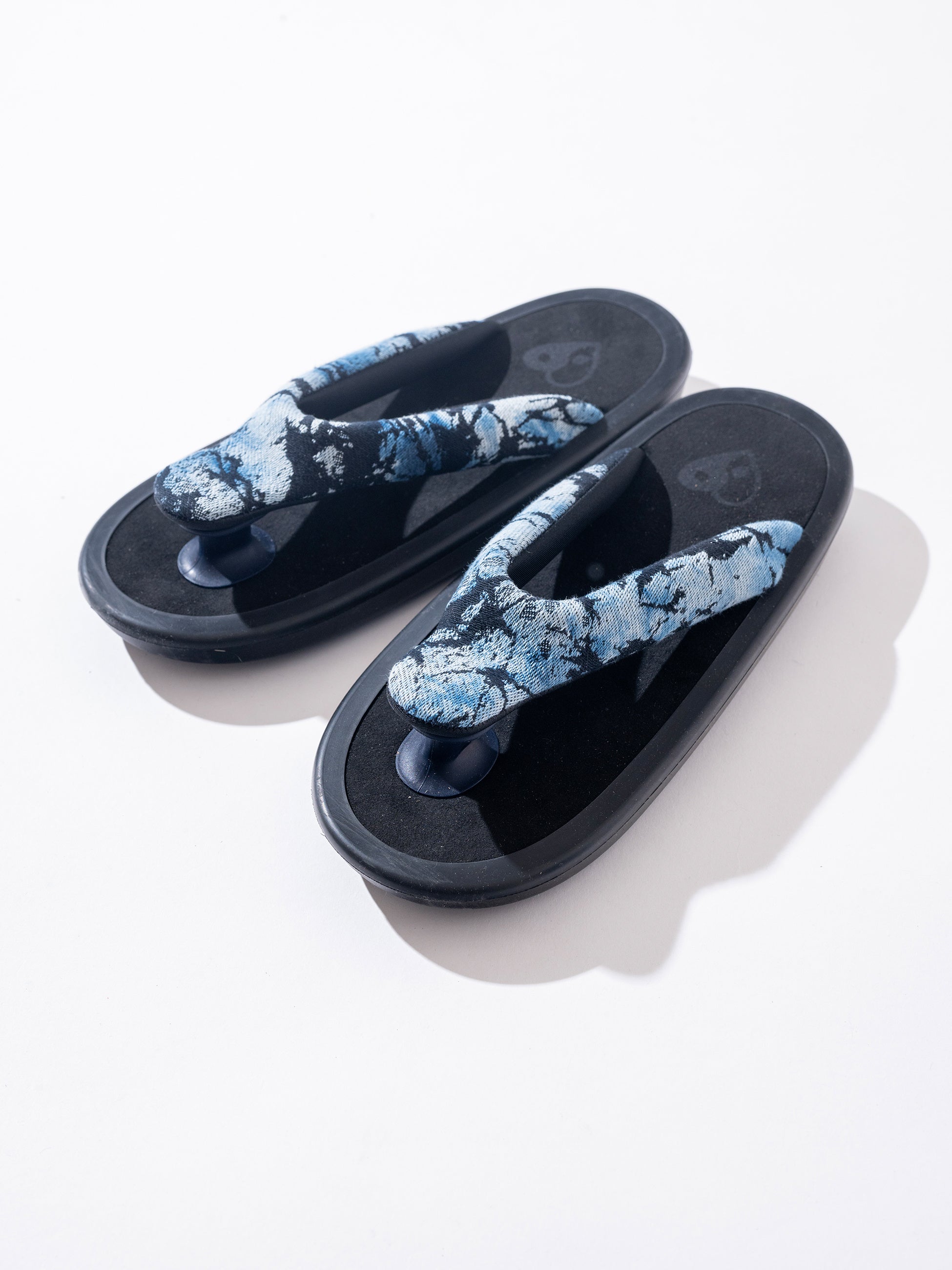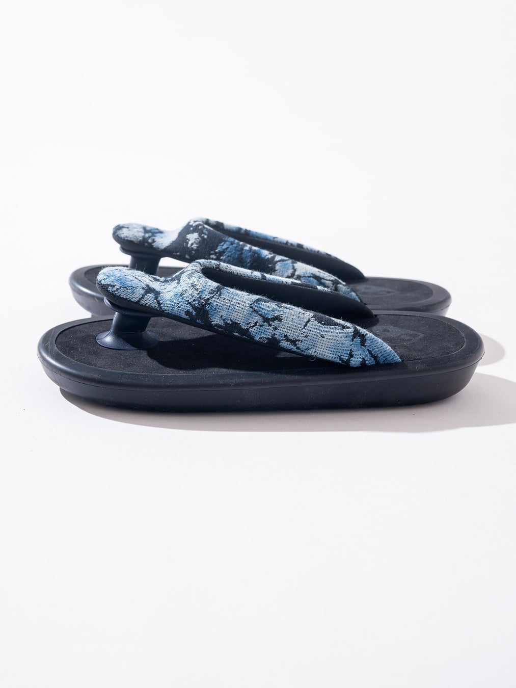 インディゴ絞りによるガラスパターン生地と、草履由来の構造を掛け合わせた特別仕様です。日常使いに適した実用性と、落ち着いた存在感を兼ね備えた一足に仕上げています。