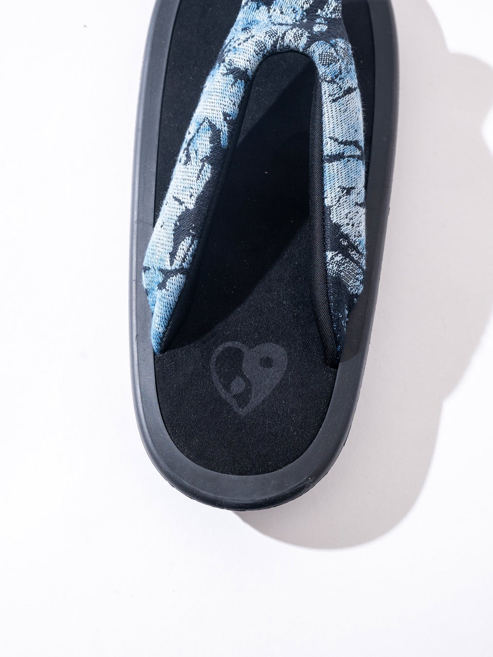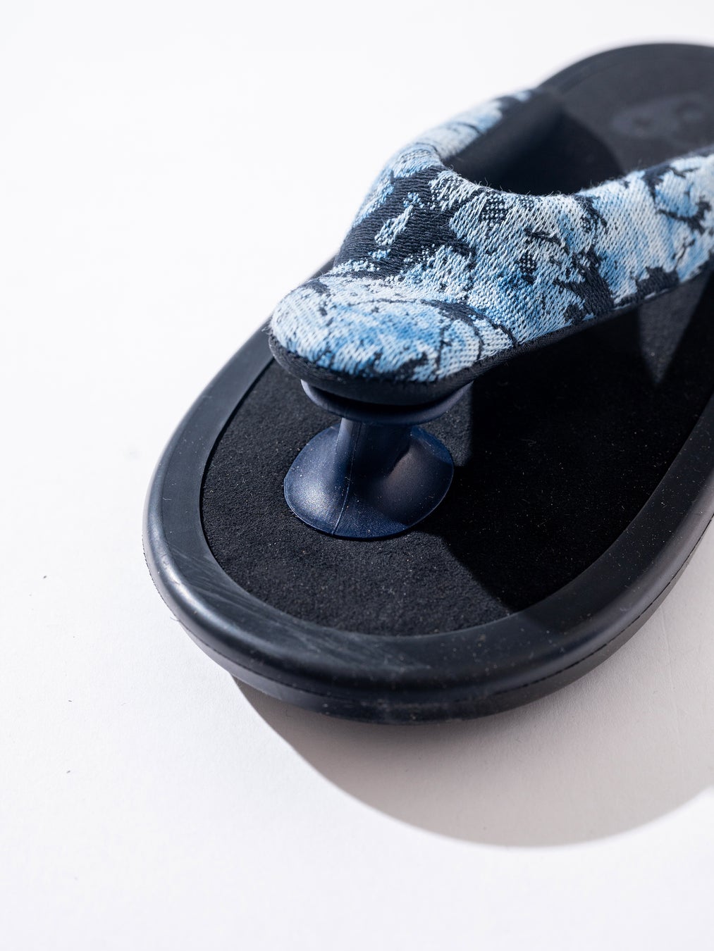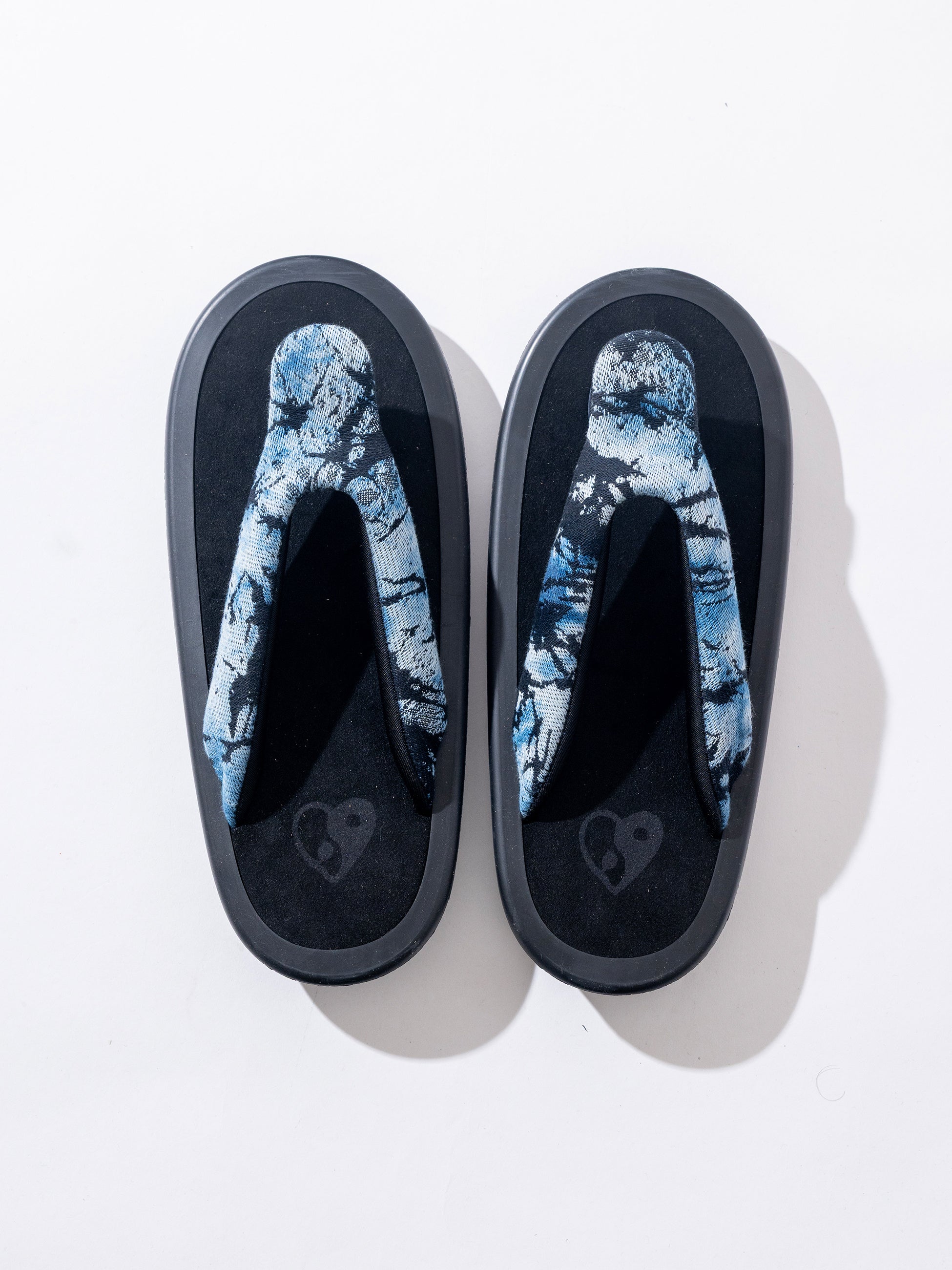 今回のコラボレーションでは、花緒に「玻璃」をイメージしたガラスパターンの生地を採用。生地には一枚一枚インディゴ絞りを施し、素材の表情を 引き出しました。奥行きのあるガラスパターンにより、上質な印象と経年変化の両方を楽しめる仕上がりとなっています。