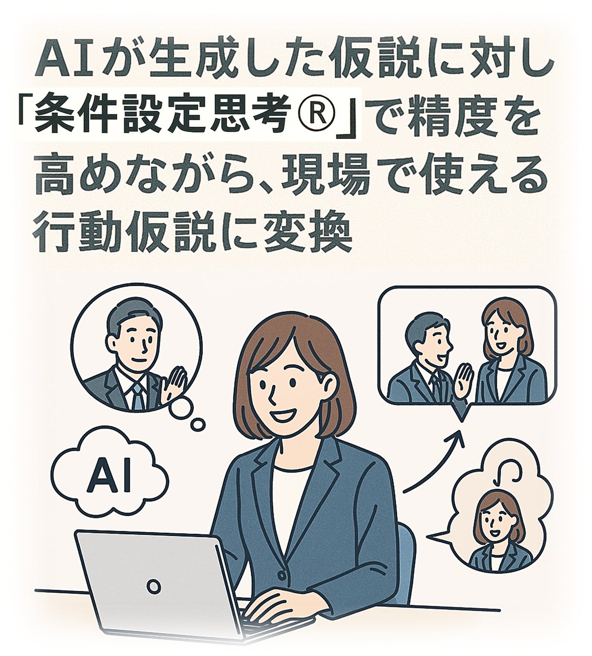 AIが生成した仮説に対し「条件設定思考®」で精度を高めながら、現場で使える行動仮説に変換。