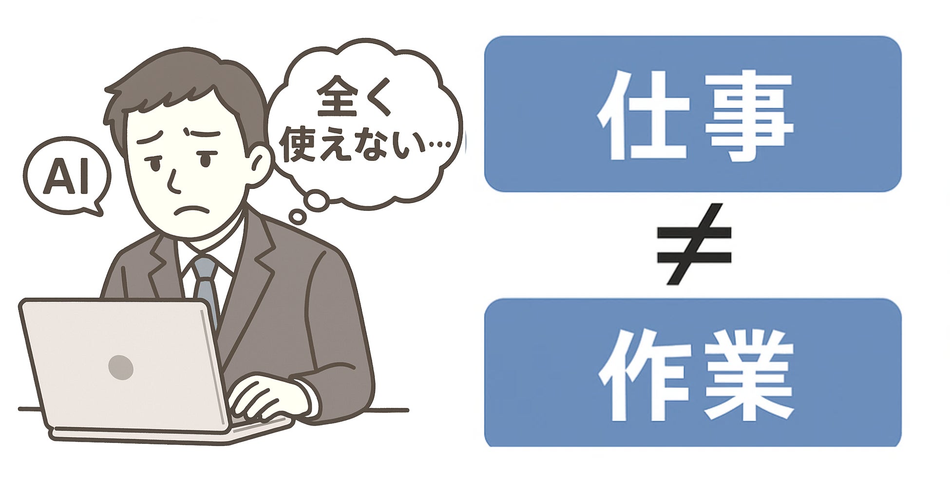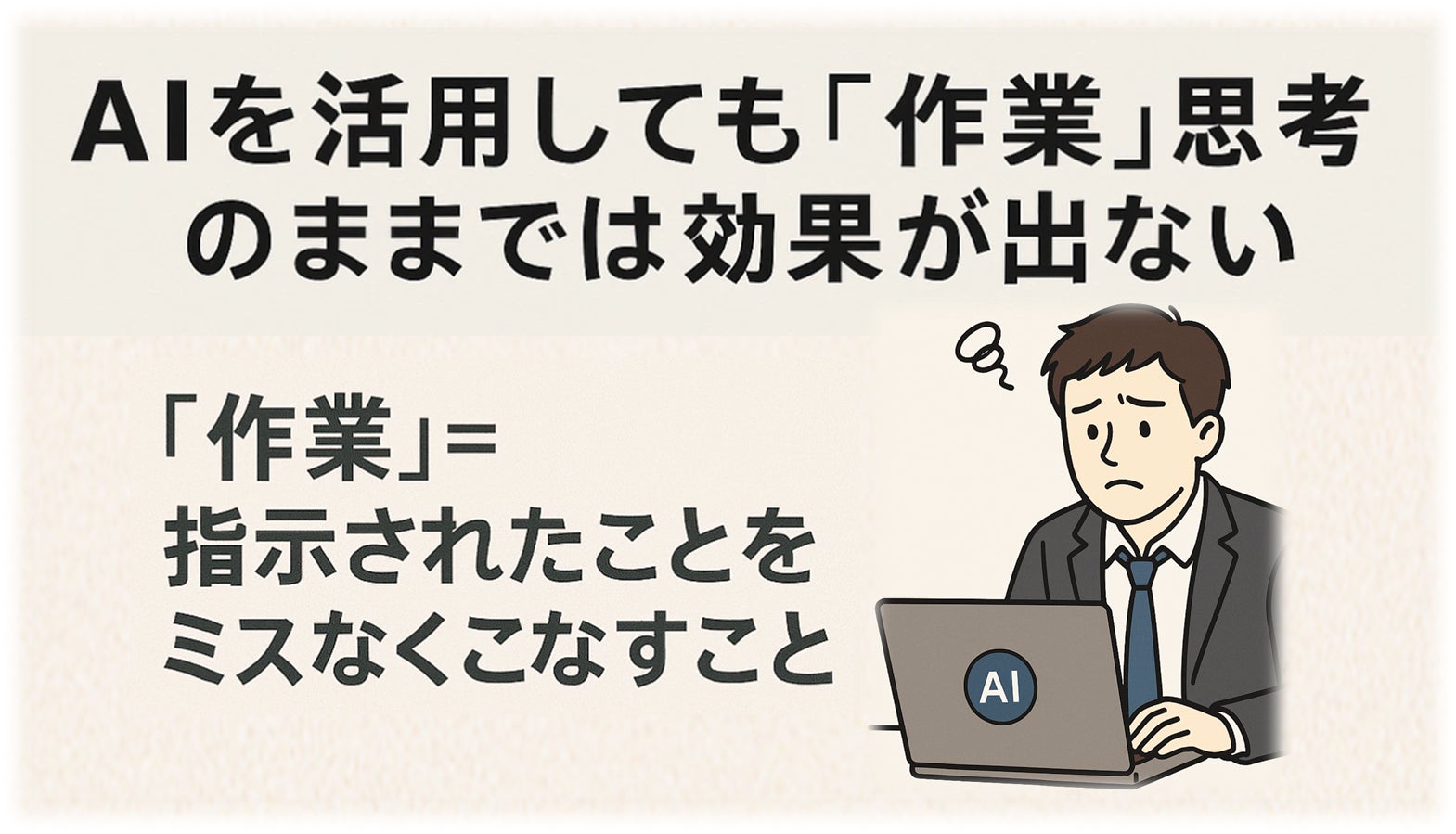 多くの企業でAI導入が進む一方で、「AIを使いこなせていない社員」 という課題が顕在化しています。その根本原因は、社員が 「仕事」と「作業」の違いを経験せず、AIの出力結果を「作業」として扱ってしまうことにあります。