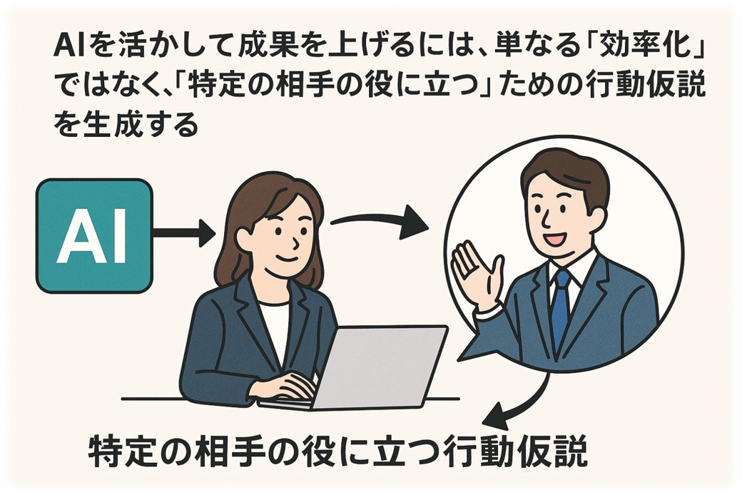 AIを活かして成果を上げるには、単なる「効率化」ではなく、「特定の相手の役に立つ」 ための行動仮説を生成し、状況に応じて微調整していくことが求められます。