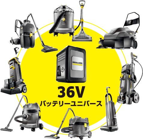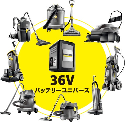 バッテリーユニバースは、ケルヒャーの共通プラットフォームです。18V、36Vの各電圧専用バッテリーをケルヒャーの様々な対応製品で共有することができ、効率的なバッテリー管理と導入コストの軽減に役立ちます。