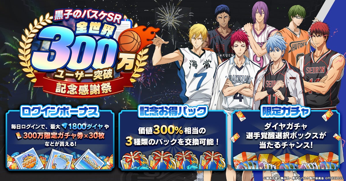 株式会社ファイブクロスは、アニメ『黒子のバスケ』の3Dバスケゲーム『黒子のバスケ Street Rivals』(黒バスSR)において、全世界300万ユーザーを突破したことを発表いたしました。