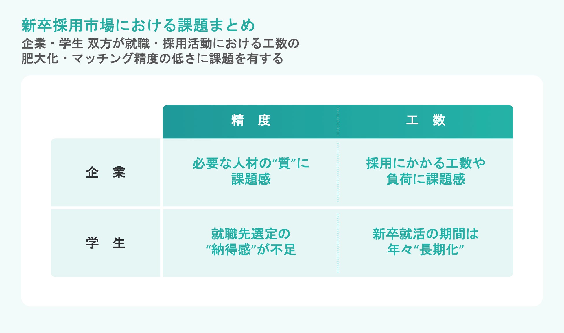 現在の新卒採用市場においては、企業と学生の双方が「活動工数の肥大化」と「マッチング精度の低さ」という二重の構造的課題に直面しています。