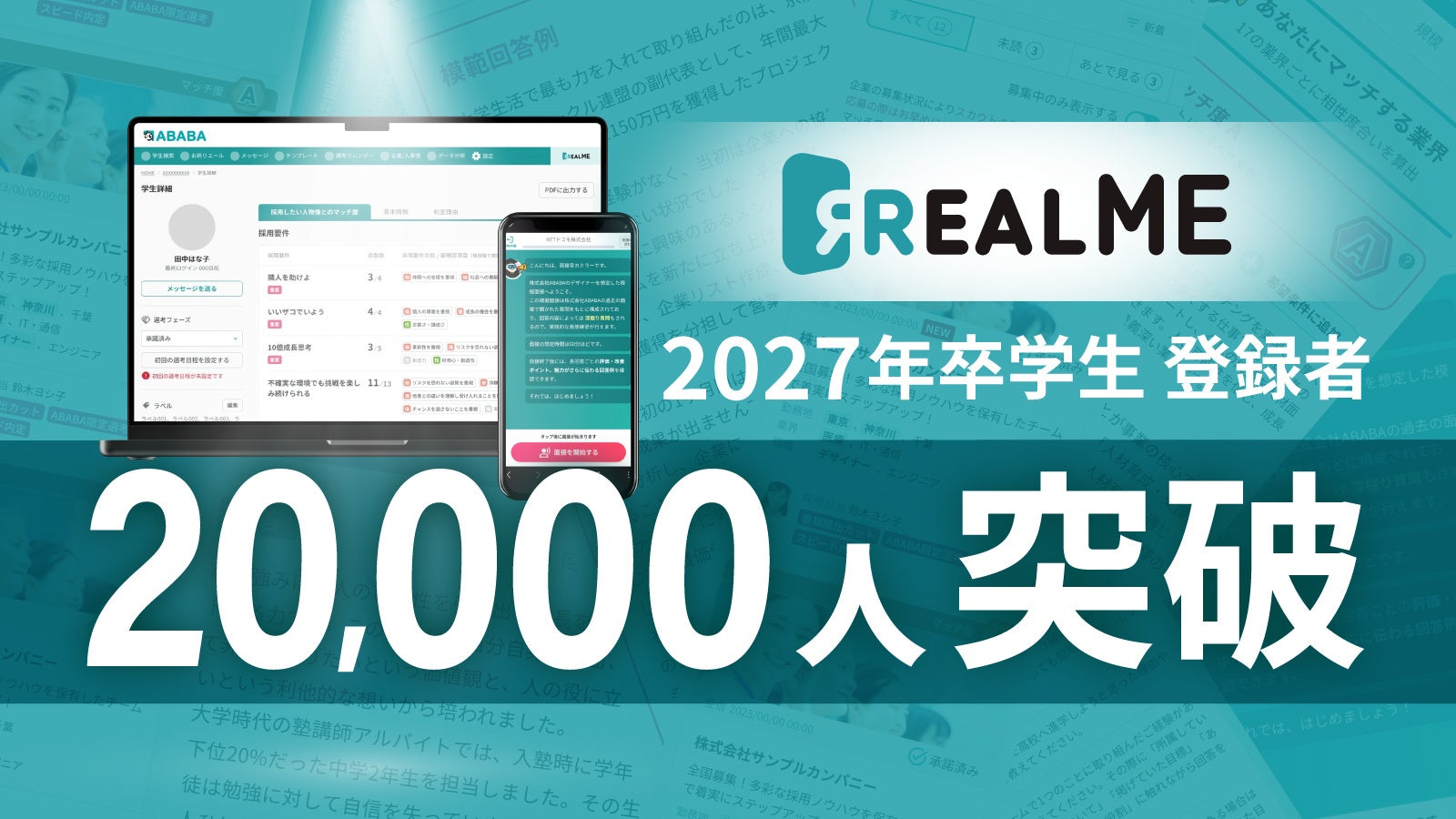 株式会社ABABA(本社:東京都渋谷区、代表:久保駿貴・中井達也)は、当社サービス『REALME』について、2027年卒学生の登録者数が2万人を突破したことをお知らせします。