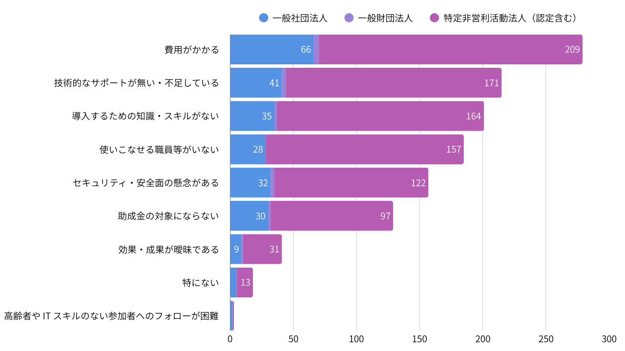内閣府の調査(*2)によると、NPO法人の約5割が年間予算500万円未満で運営されています。また、デジタル化の進捗を妨げる要因として「費用がかかる」ことが最も多く挙げられています(*3)。