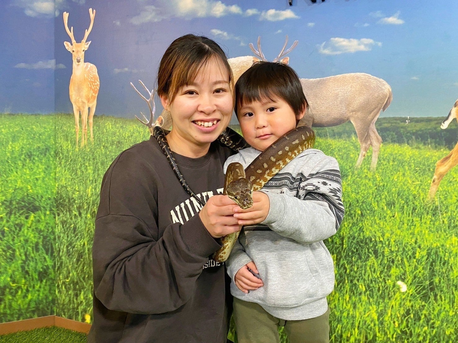 全長2メートルを超える迫力あるセントラルパイソンと一緒に、特別な記念写真を撮影できます。展示だけでは感じられない本物の蛇のスケールを、間近で感じられるチャンスです。(1回1000円/ 土日祝限定)