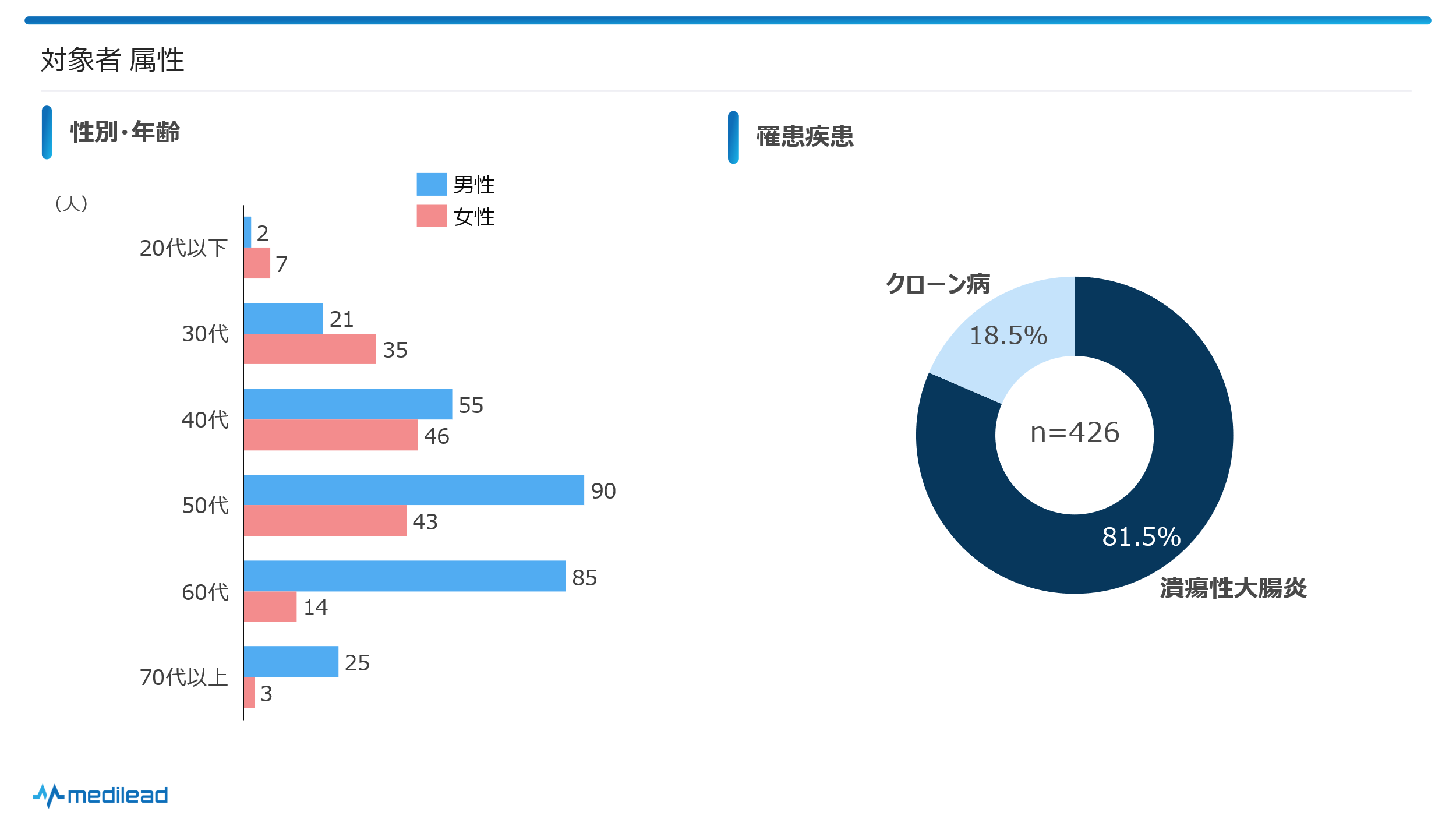 今回の調査におけるIBD患者426名の属性は以下のとおりです。〈図1〉