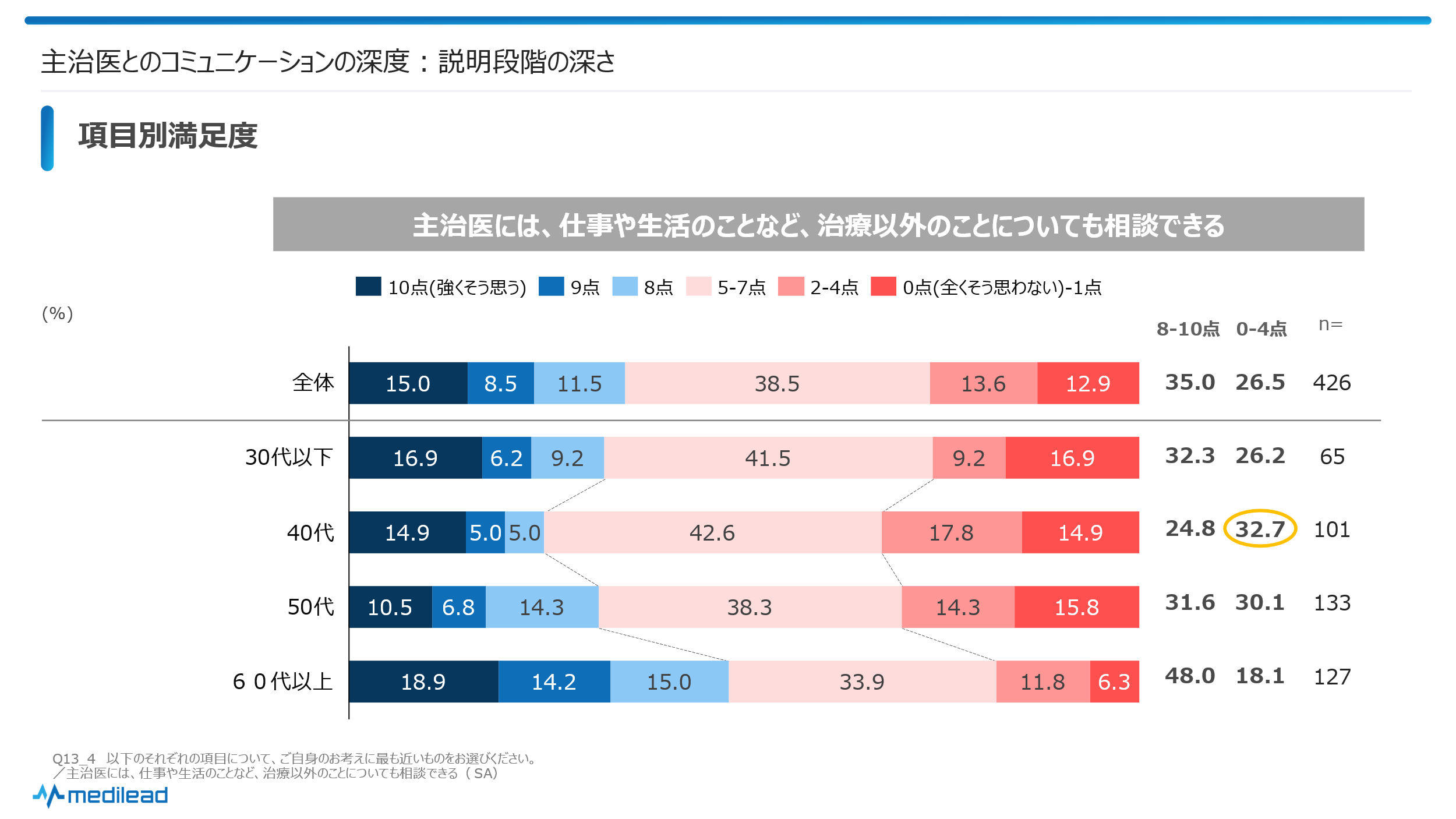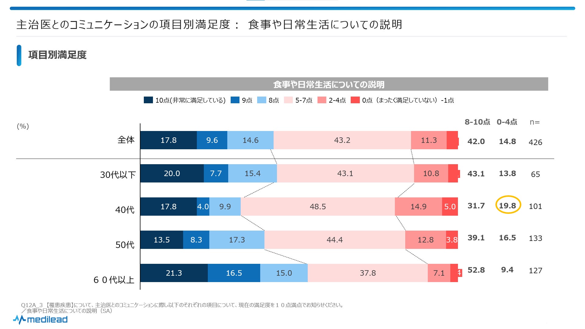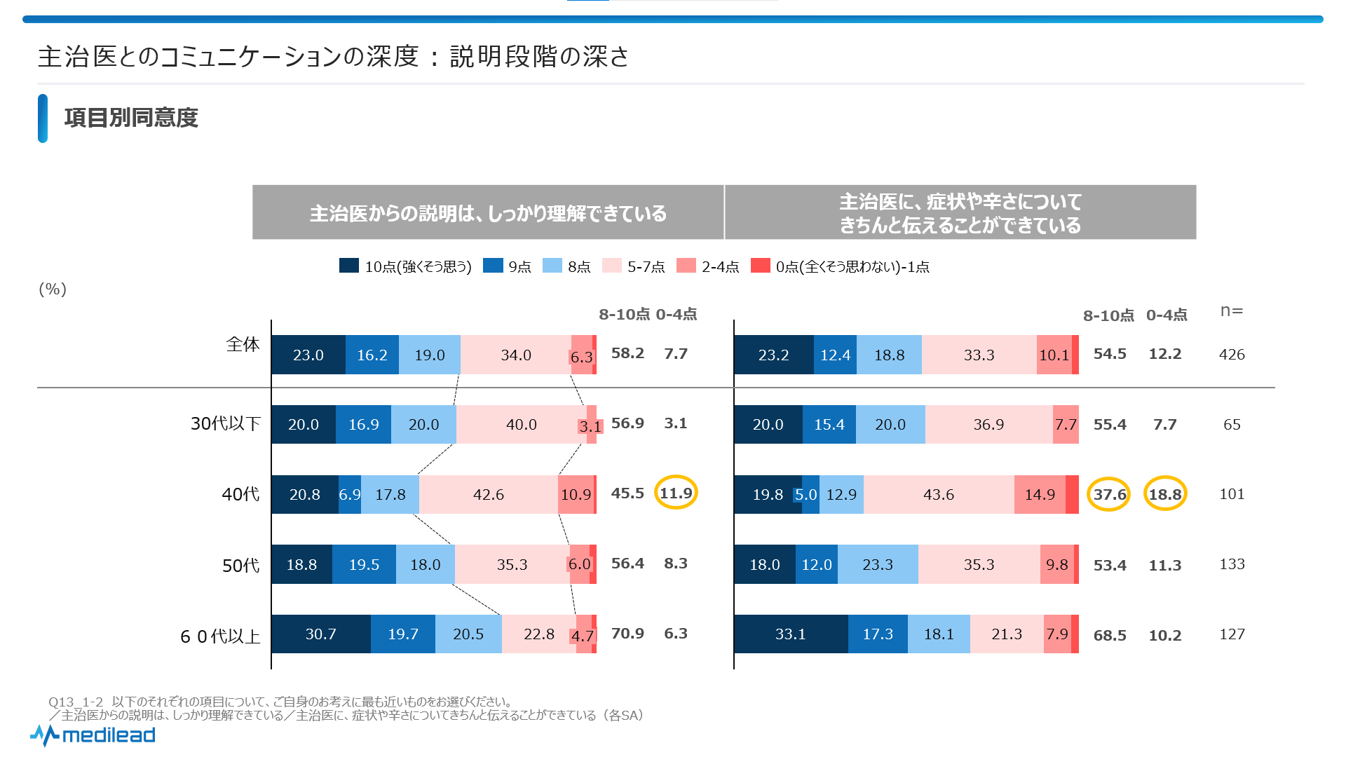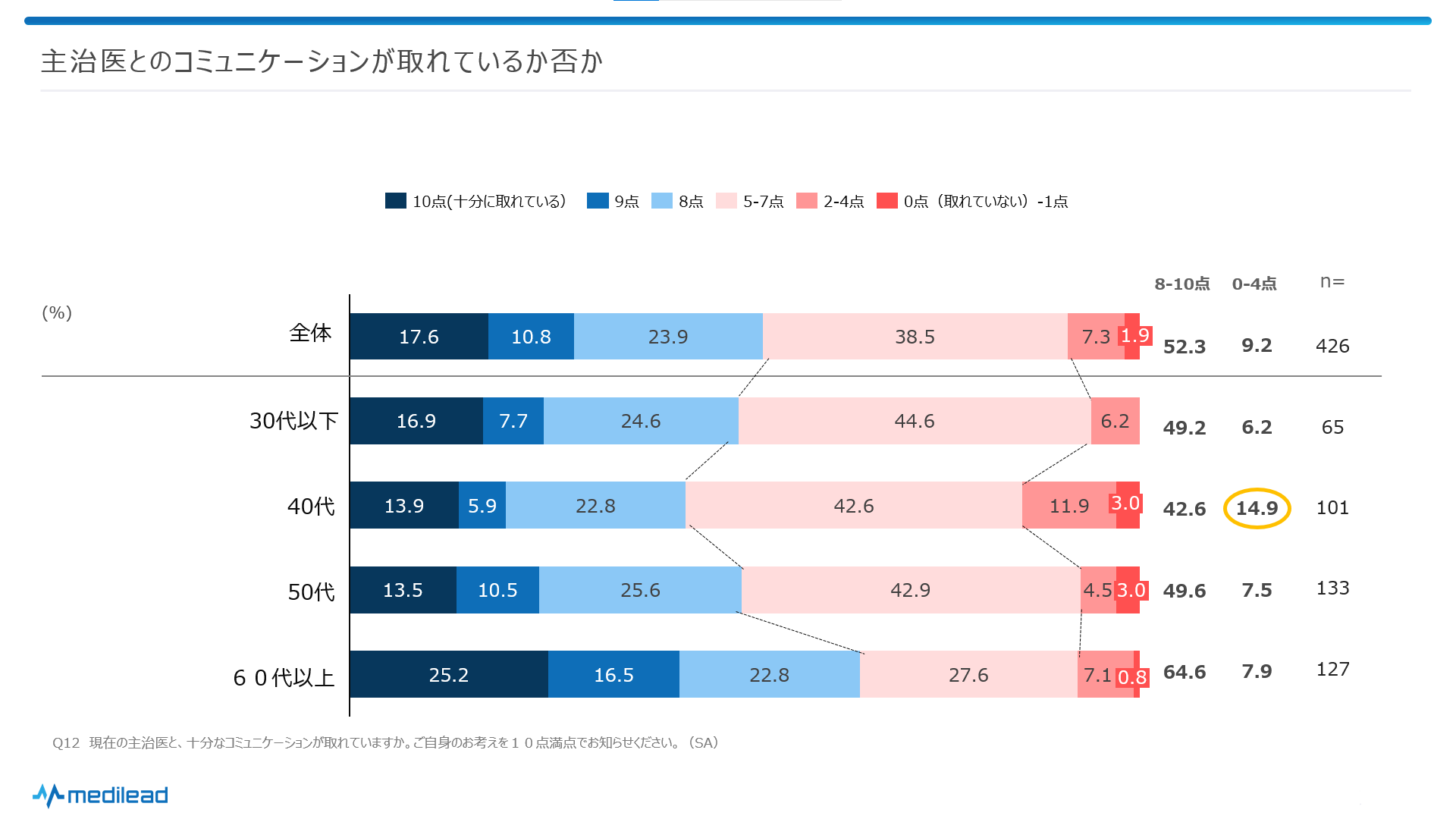 病気や治療に関する基本的なコミュニケーションの満足度は40代で低め。「主治医に、症状や辛さについてきちんと伝えることができている」については、40代で8-10点の割合が低く(全体54.5%のところ37.6%)、0-4点の割合が高く(全体12.2%のところ18.8%)、「自身の状況の伝達は不十分」だと感じている方が多い。