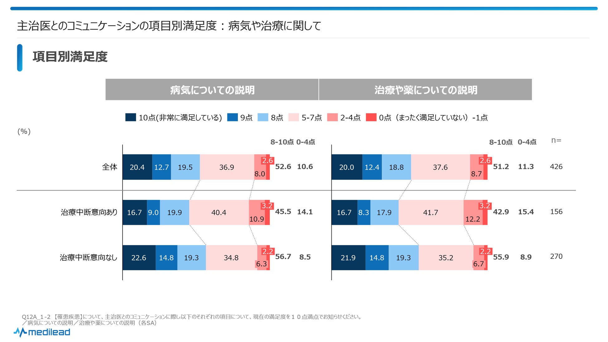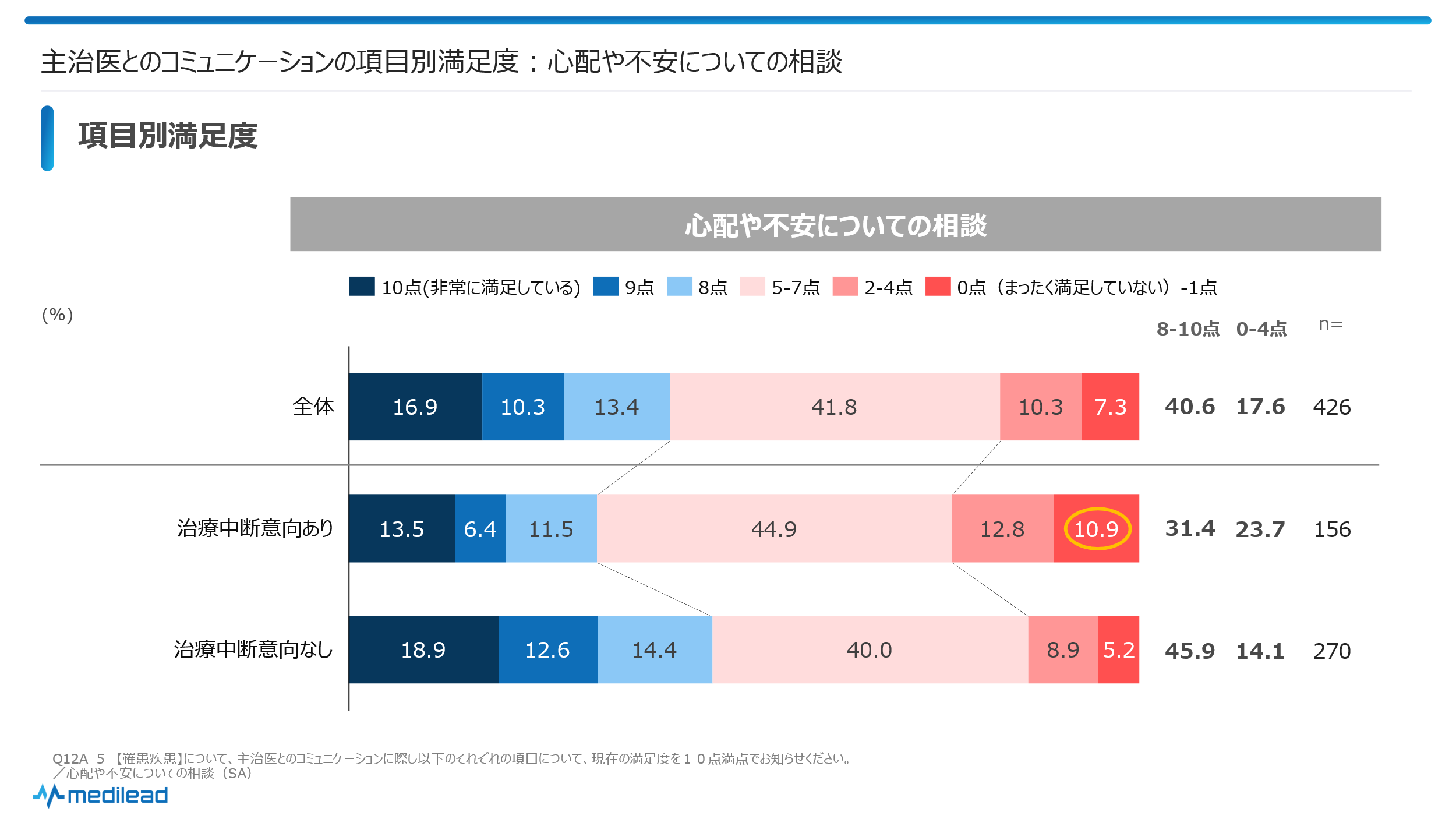 IBD患者さんの治療継続において、主治医とのコミュニケーションが重要であることが推察される結果になりました。特に、生活や仕事に関する相談や心配・不安に対するサポートが不足していると感じる患者さんが多く、これが治療の中断意向に影響していると考えられます。