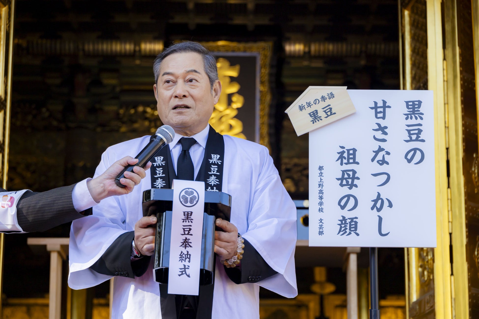 黒豆奉納式の後は、都立上野高等学校の生徒が詠んだ「新年を祝う」「新しい年の幸せを願う」俳句の中から、松平健氏に一番好きな作品を選定、お披露目していただきました。選ばれた俳句「黒豆の甘さなつかし祖母の顔」には、新年の季語である“黒豆”も入っており、「黒豆奉納式」にもぴったりな一句となりました。