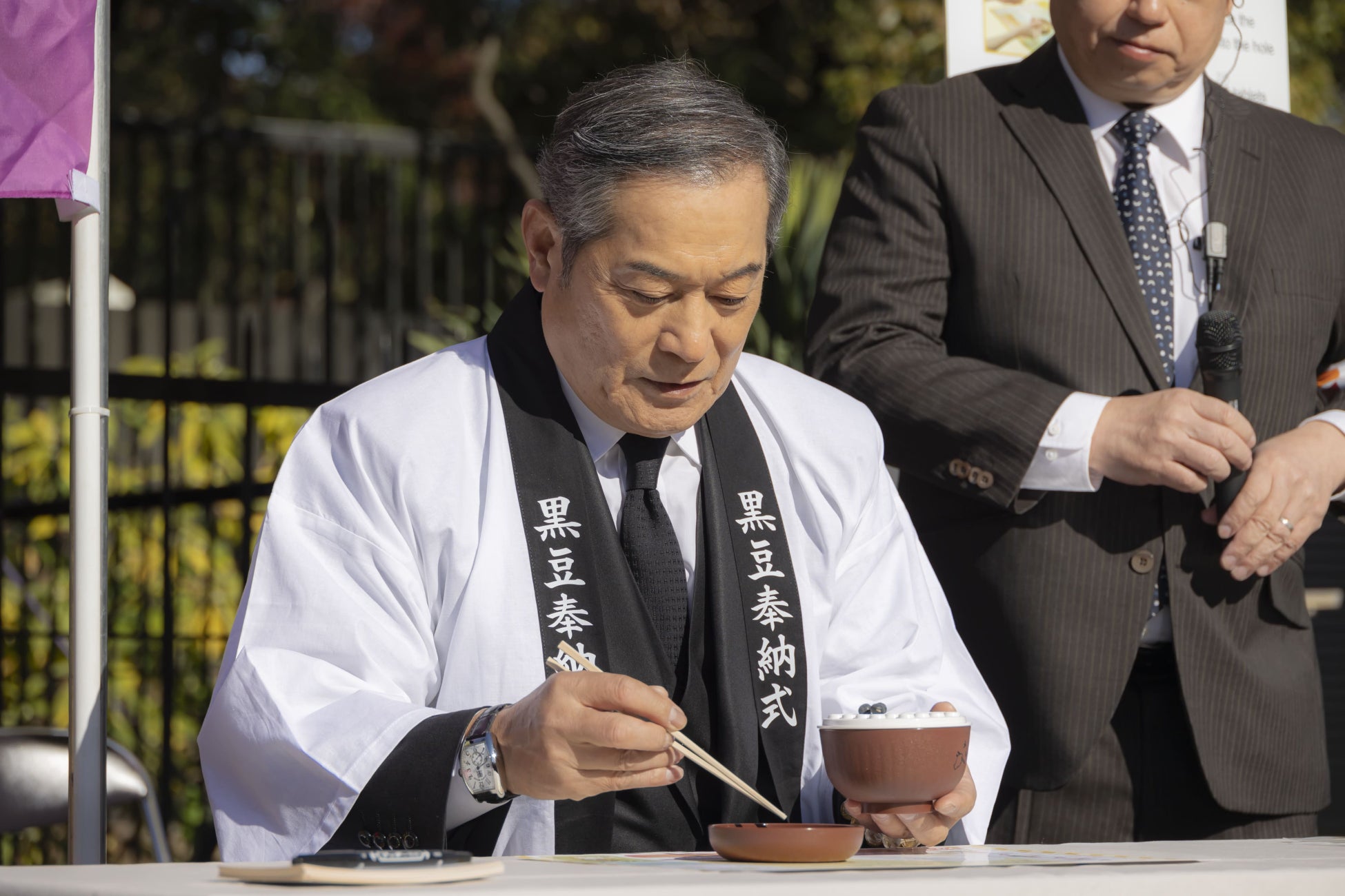 また、「黒豆奉納式」後には、今回の奉納式に合わせたお裾分けとして、上野東照宮のご参拝者を対象に「黒豆のふるまい」「黒豆つかみゲーム」を境内にて実施しました。松平健氏には、箸使いを学ぶゲーム「黒豆つかみゲーム」に参加いただき、時間内に掴めた黒豆31粒と同じ数の「黒豆のふるまい」をご参拝者に直接お渡しいただきました。実際に松平健氏からふるまいを受けたご参拝者の方からは「まさか松平さんから直接ふるまっていただけるとは思わなかった」と喜びの声も聞こえました。