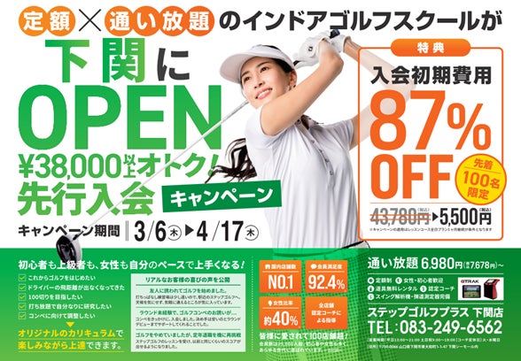 インドアゴルフスクールを運営するステップゴルフ株式会社(本社:東京都渋谷区、代表取締役:榎本考修 以下、ステップゴルフ)は、2025年5月23日(金)より、JR下関駅からほど近いシーモール駐車場新館ビル1階に、山口県では初出店となる『ステップゴルフプラス下関店』をグランドオープン予定※です。また、オープンに先駆け、3月6日(木)より先行入会を受付開始いたします。