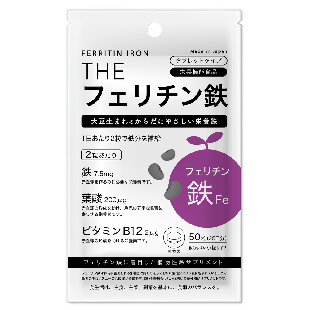 フェリチンとは、体内のあらゆるところに存在し、鉄分を貯蔵することができる鉄貯蔵タンパク質のことです。負担をかけずにスムーズに吸収することができます。大豆由来のからだに優しい鉄であるため、鉄分不足の方、サプリメントに抵抗がある方にも続けやすく鉄分補給ができる栄養補助食品です。