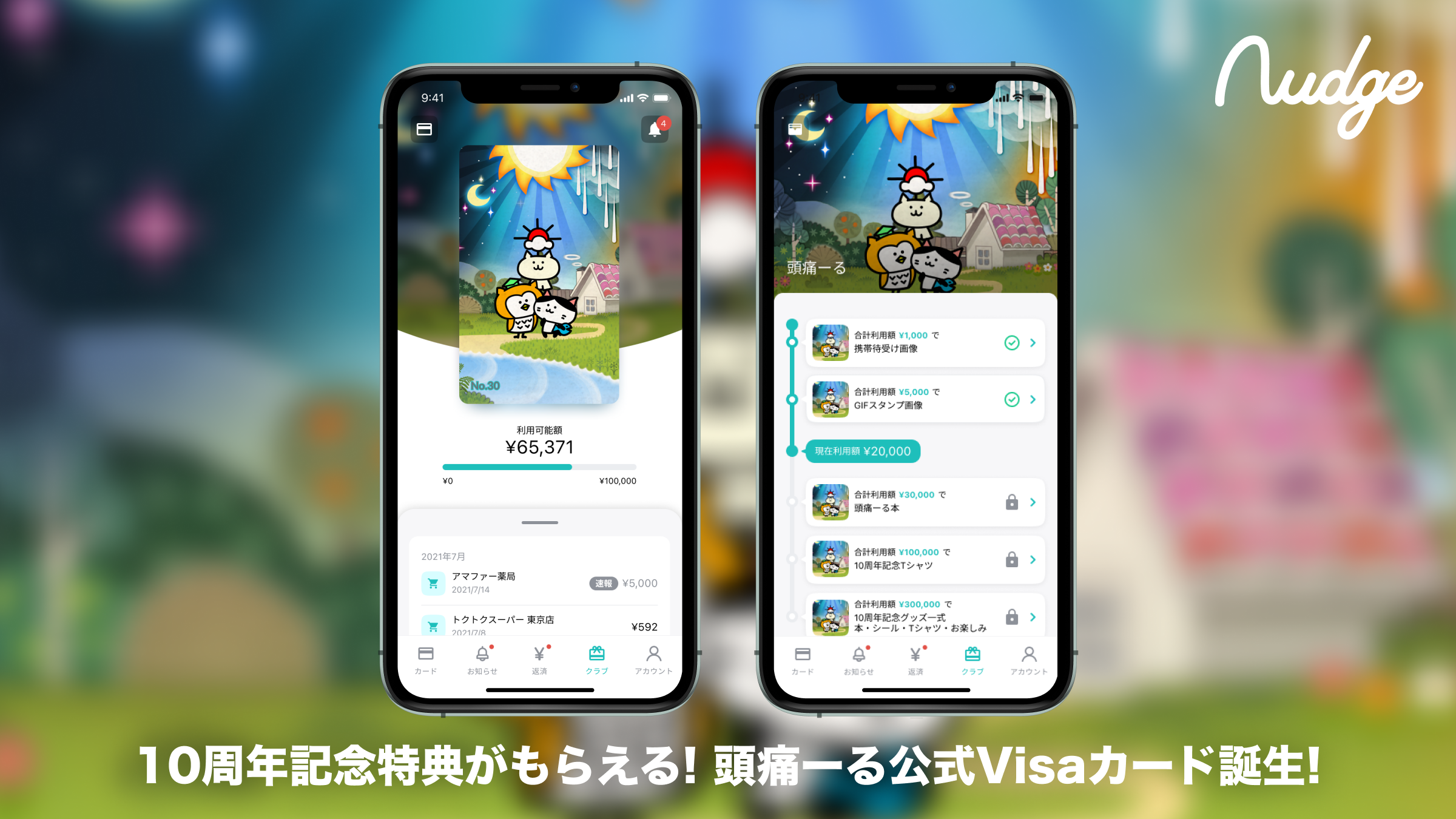 本クラブに入会すると、普段のお買い物などで「Nudge」のクレジットカードをご利用いただくだけで「頭痛―る」の応援・支援につながります。さらに、カード利用金額に応じて「頭痛―る」クラブオリジナルスタンプ、頭痛―る本、頭痛―る10周年記念グッズなどの特典を受けることができます。