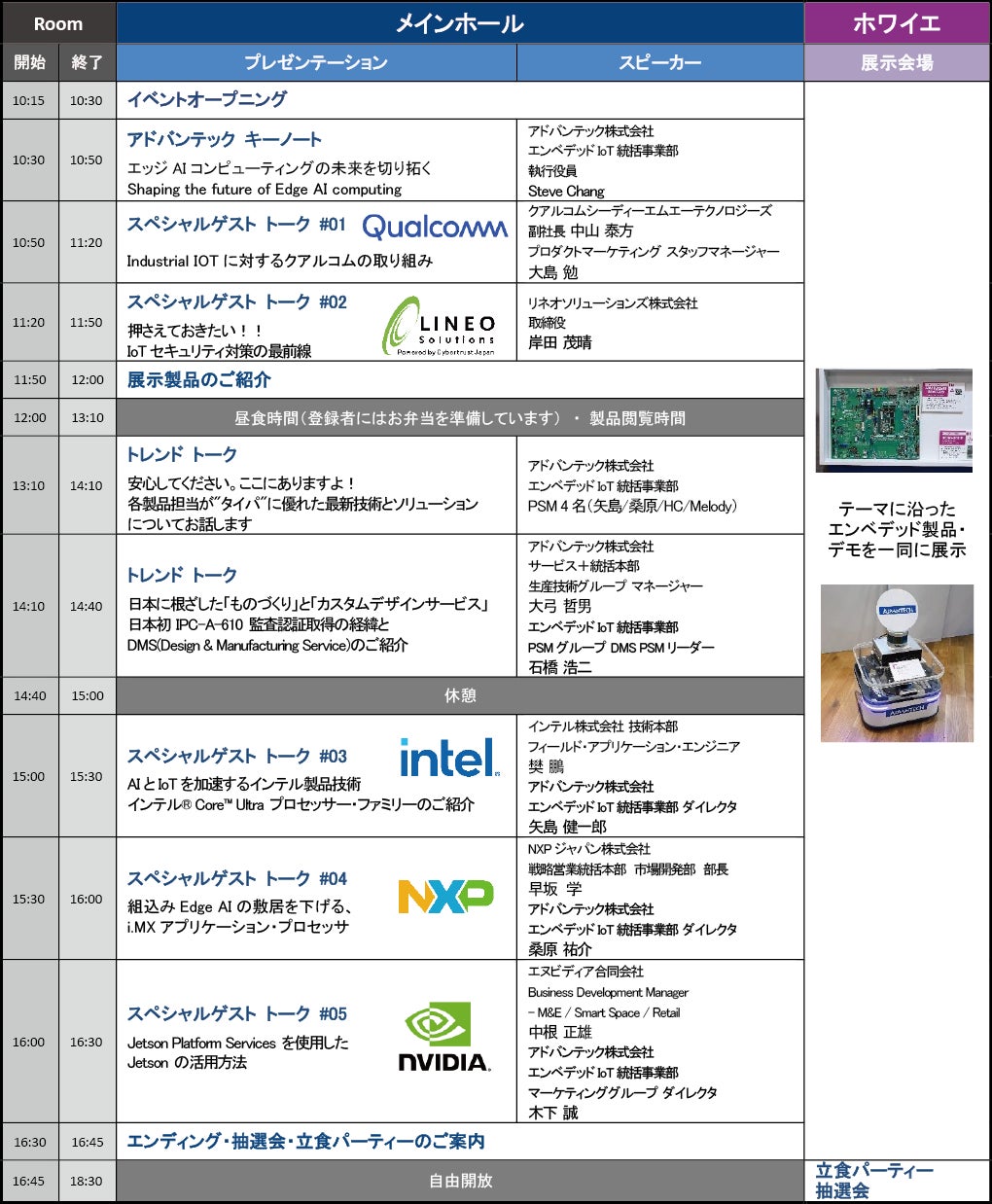 本フォーラムは、組込みPC・デバイスについてご興味のある法人様を対象に毎年開催しており、2024年は、Intel社、NVIDIA社、NXP社、Qualcomm社といった業界を牽引するシリコンベンダー様のセミナーに加え、リネオソリューションズ社によるテクノロジートークを行います。また、アドバンテックの最新の組込みPCはもちろんエコパートナー様による展示など、皆様の今後のビジネスにお役立ていただけるよう、より具体的なコンテンツをご用意しました。
