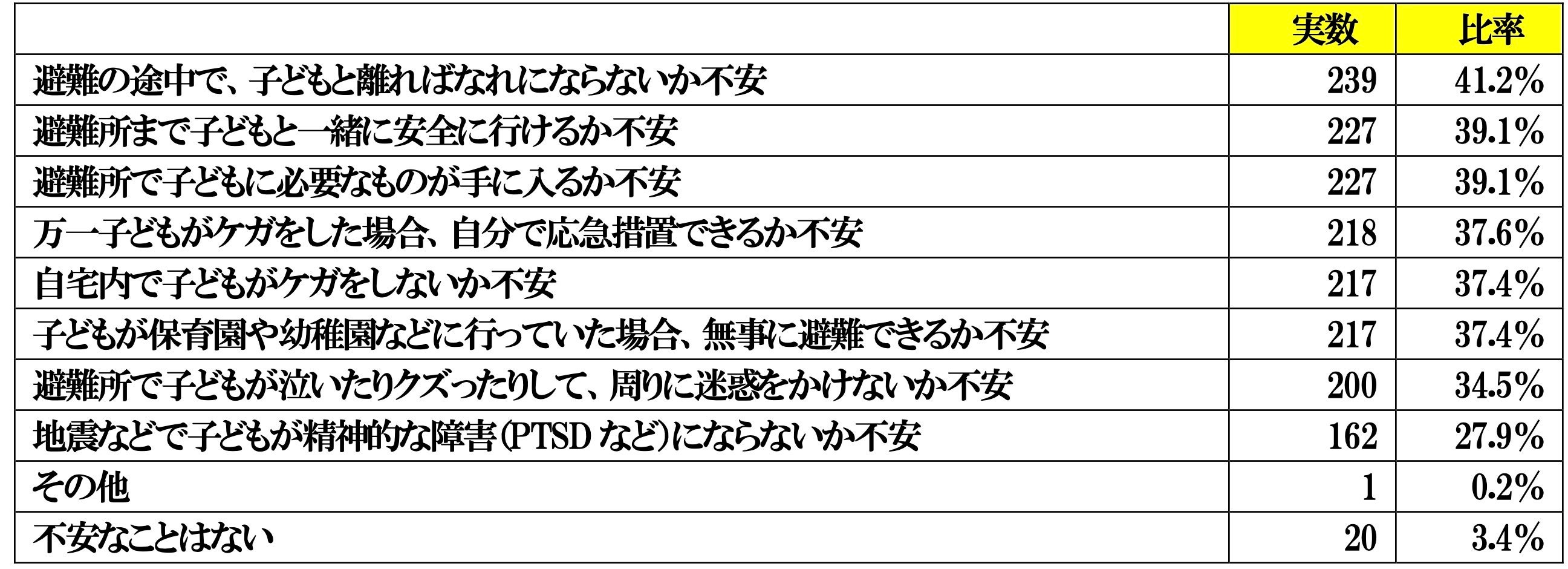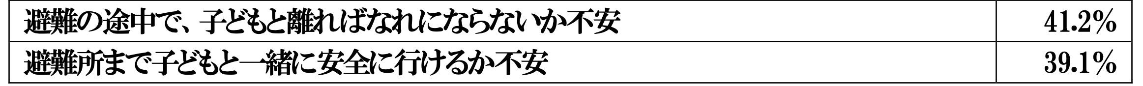 ●地震などの際に、子どもに関することで、不安に感じていることでは、「避難の途中で、子どもと離ればなれにならないか不安」が4割以上に達しています。