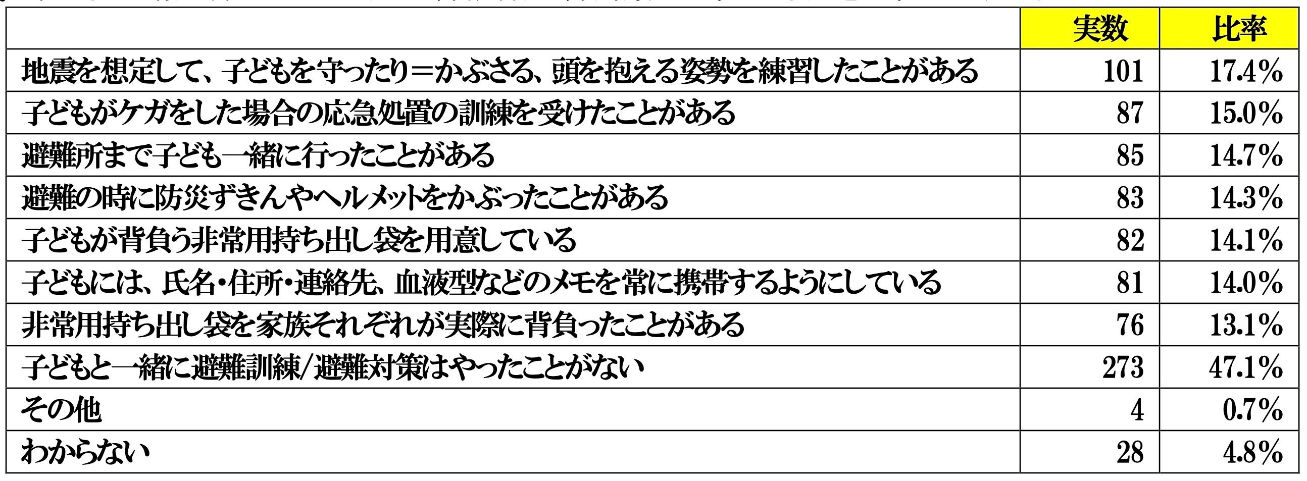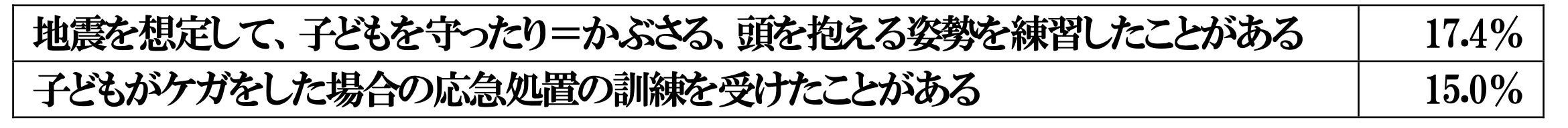●子どもと一緒に行ったことのある避難訓練/避難対策では、最も多かった「地震を想定して、子どもを守ったり=かぶさる、頭を抱える姿勢を練習したことがある」でも17.4%にとどまっています。