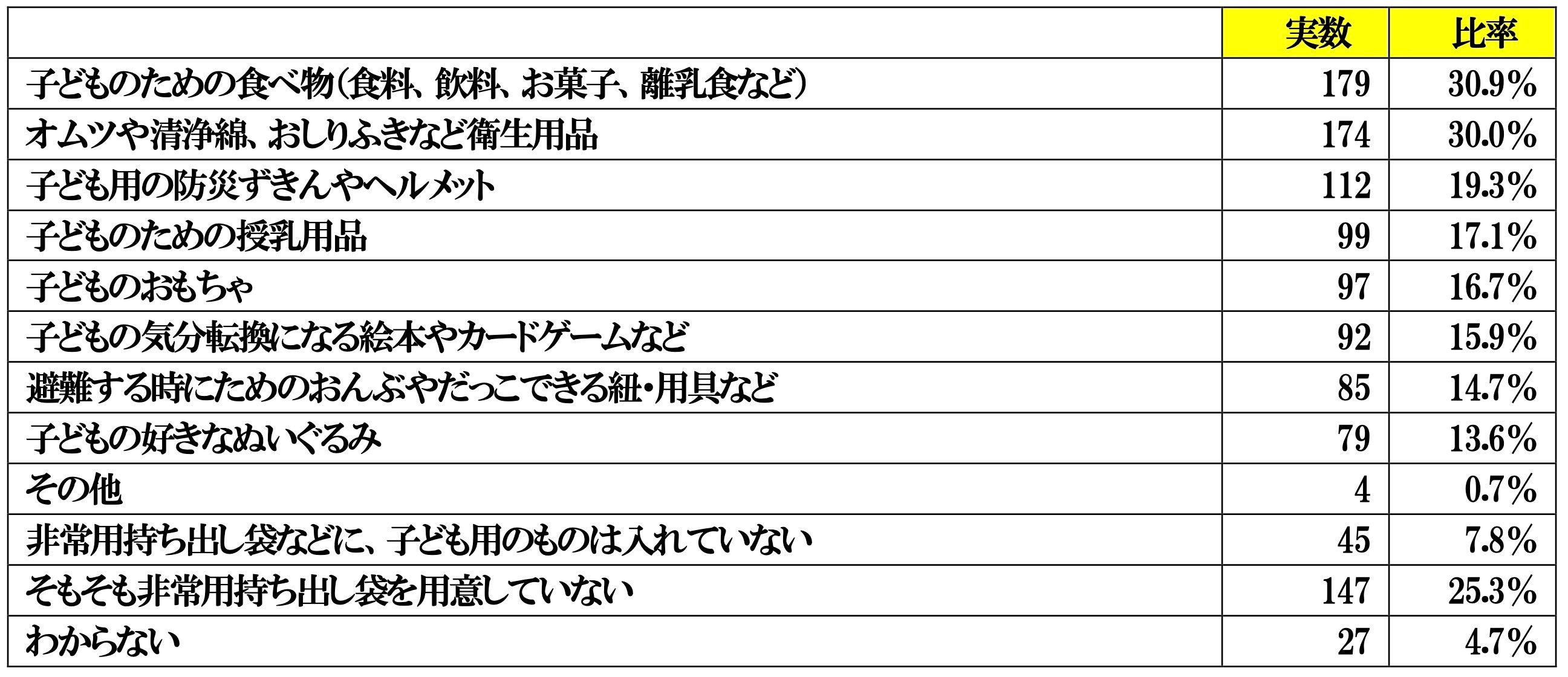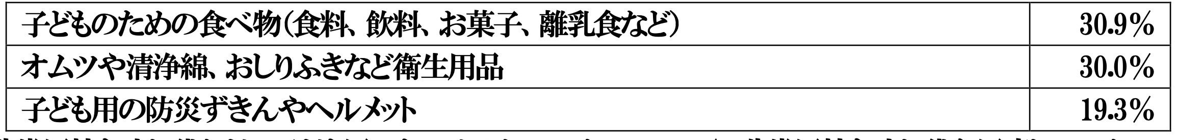 ●地震などの時に子どもと一緒に避難するために非常用持ち出し袋に入れているもの(袋と一緒においてあるものも含む)を複数回答で聞いたところ、3割以上になったのが「子どものための食べ物/食料、飲料、お菓子、離乳食など(30.9%)」、「オムツや清浄綿、おしりふきなど衛生用品(30.0%)」の二つにとどまっており、多くの家庭で非常用持ち出し袋を子ども目線で改める必要があることが判明しました。