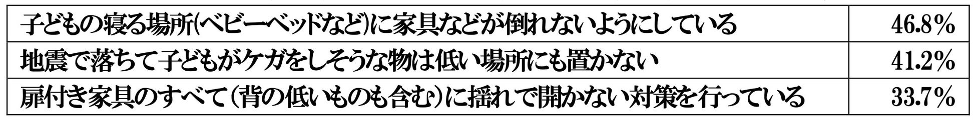 ●子ども目線での住まいの地震対策としては「子どもの寝る場所(ベビーベッドなど)に家具などが倒れないようにしている(46.8%)」「地震で落ちて子どもがケガをしそうな物は低い場所にも置かない(41.2%)」が上位です。