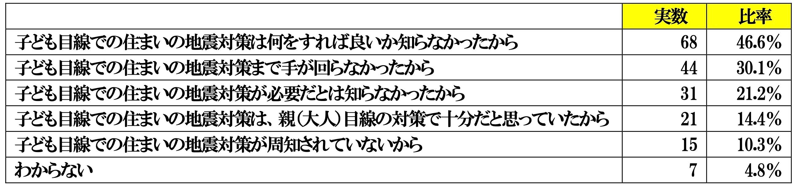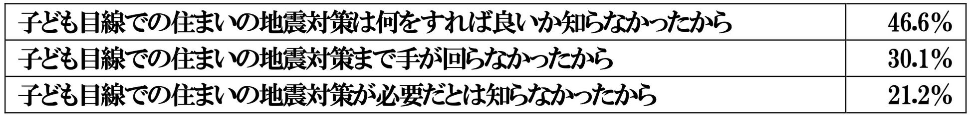 ●子ども目線での住まいの地震対策をあまり行っていない方に理由を聞いたところ、「子ども目線での住まいの地震対策は何をすれば良いか知らなかったから(46.6%)」が最も多く、子ども目線での具体的な地震対策の周知が必要であることが判明しました。