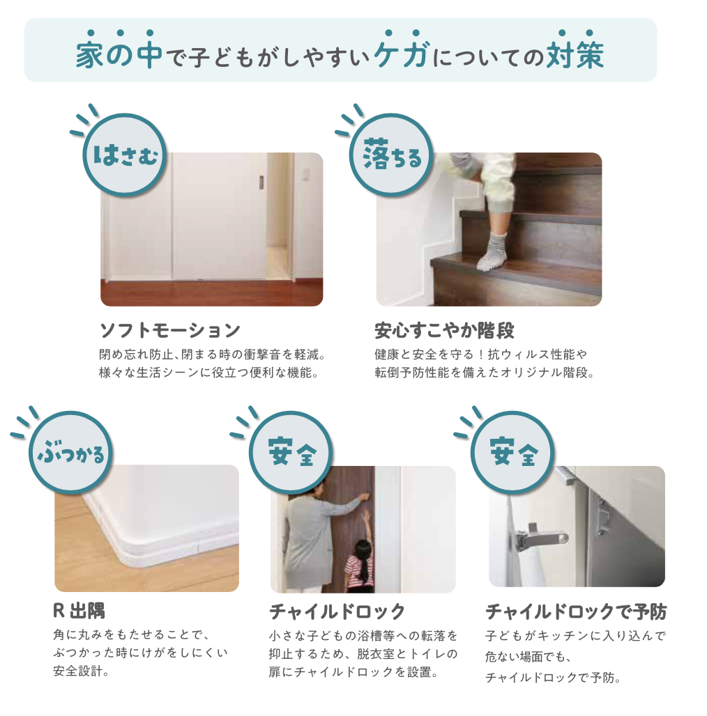 この「子育てしやすい家」では、子どもはもちろん、すべての世代の人が安心して暮らせる「みんなにやさしい家」にするため、子どもの安全を基準に考えた「キッズセーフティ」という考えを採り入れています。