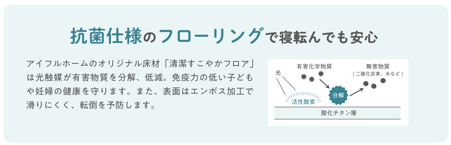 赤ちゃんのハイハイや床に広がるおもちゃの清潔面が心配な方のために、抗菌仕様のフローリングを用意して