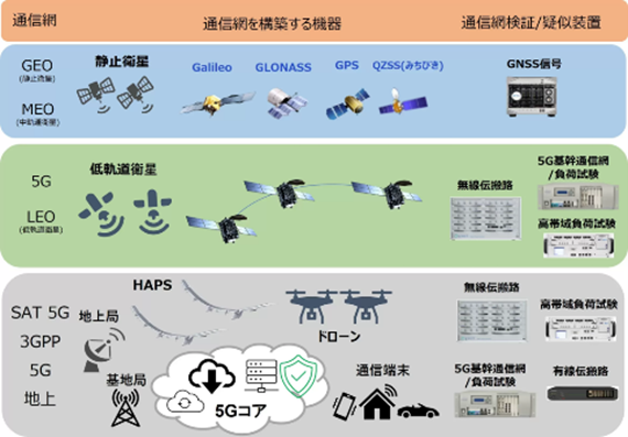 NTN(非地上系ネットワーク)のネットワーク検証/擬似装置群は、LEO(低軌道衛星)をはじめとするNTNの検証環境を提供し、宇宙空間、成層圏基盤技術で用いられる通信機器の実証実験を可能とします。