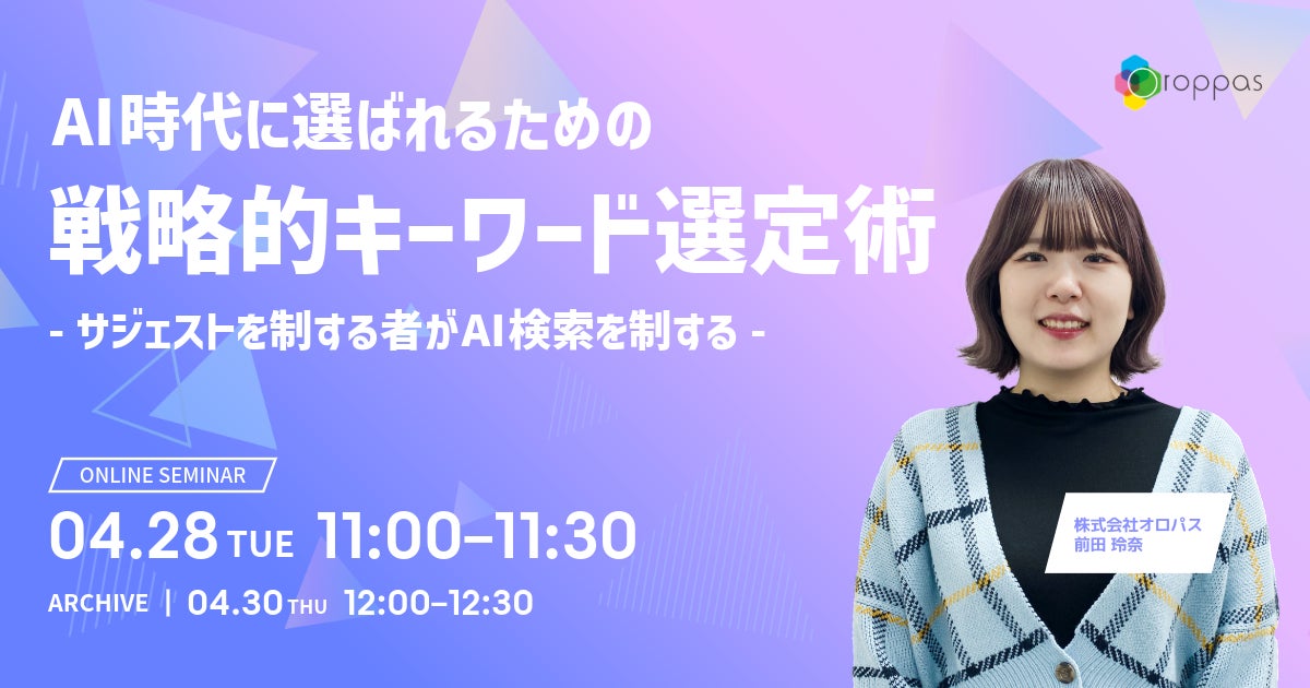 SEO/LLMOツール「パスカル」の開発・提供を行う株式会社オロパスは、2026年4月28日(火)に、AIの回答作成プロセスを読み解き、AI時代のキーワード選定方法を解説する『AI時代に選ばれるための「戦略的キーワード選定術」〜サジェストを制する者がAI検索を制する〜』を開催いたします。