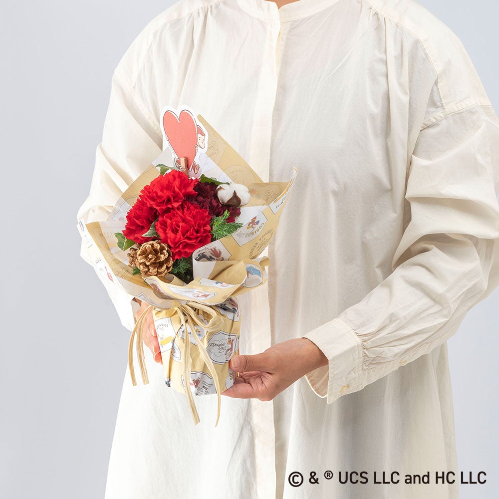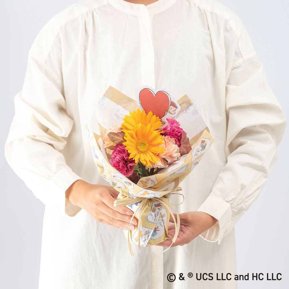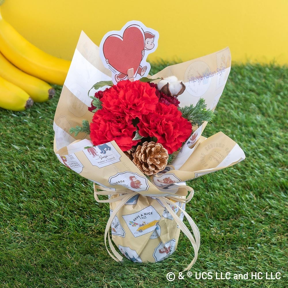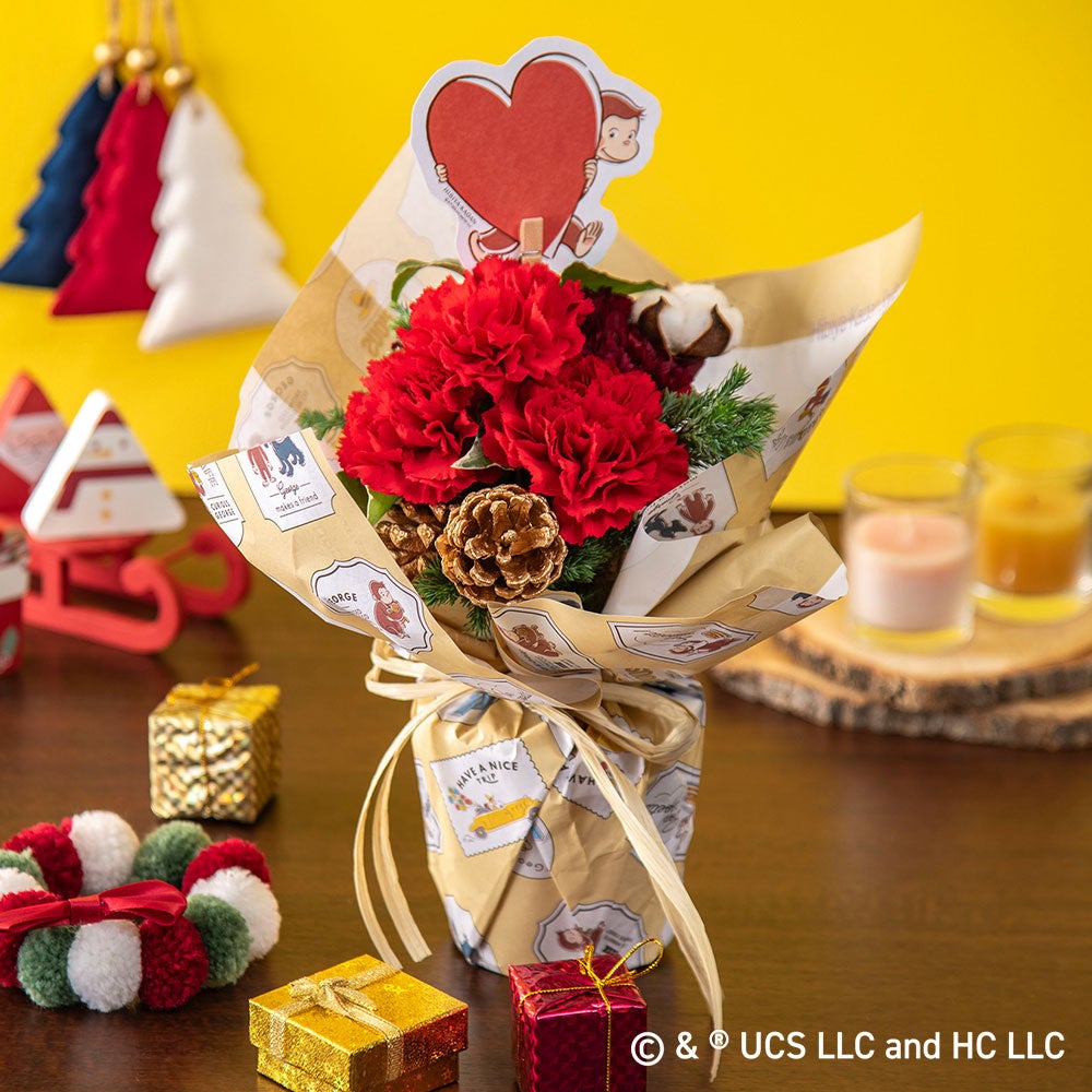 赤いカーネーションをメインにクリスマスカラーの生花を束ね、楽しげなジョージが描かれたペーパーと大きなハートから覗き込むジョージが可愛らしいタグでラッピングした花瓶要らずのそのまま飾れるブーケ。どちらもこれからのクリスマスシーズンのギフトにぴったりです。