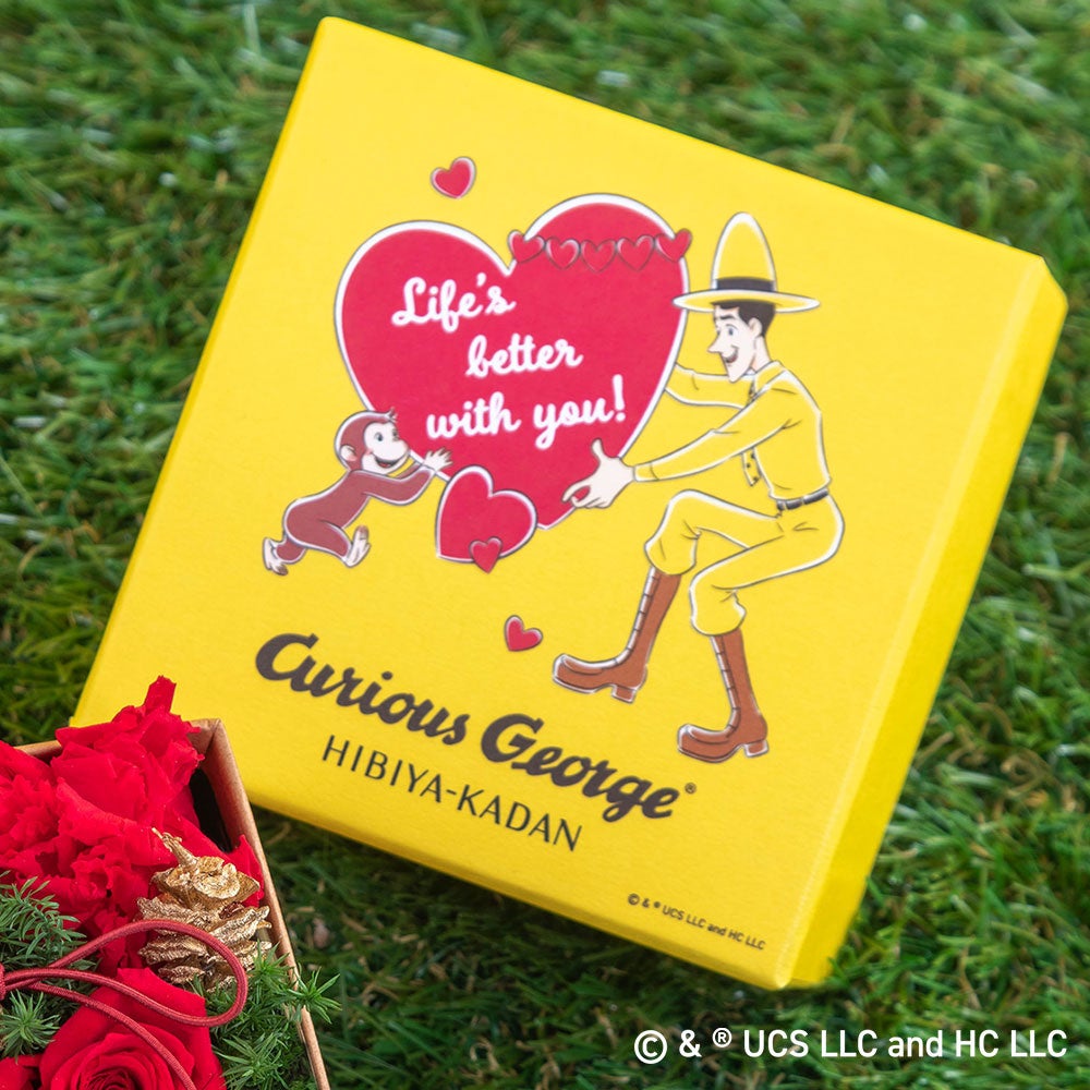 「Life's better with you!(あなたがいると、人生はもっと素敵になる!)」のメッセージ入りハートとジョージ、黄色い帽子のおじさんが描かれたイエローカラーのボックスに、生花のような色鮮やかな美しさとソフトな風合いを長期間にわたって保ち続けるプリザーブドフラワーの赤バラやドライの実物をたっぷりとアレンジしたボックスフラワー。