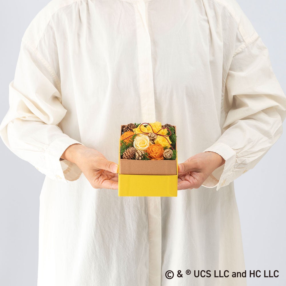 そして、おさるのジョージファンにはもちろん、お誕生日やお子様の成長を祝う記念日にもおすすめの、ジョージカラーの温かい色合いの花々でデザインしたボックスフラワーとそのまま飾れるブーケも同時にご用意しました。